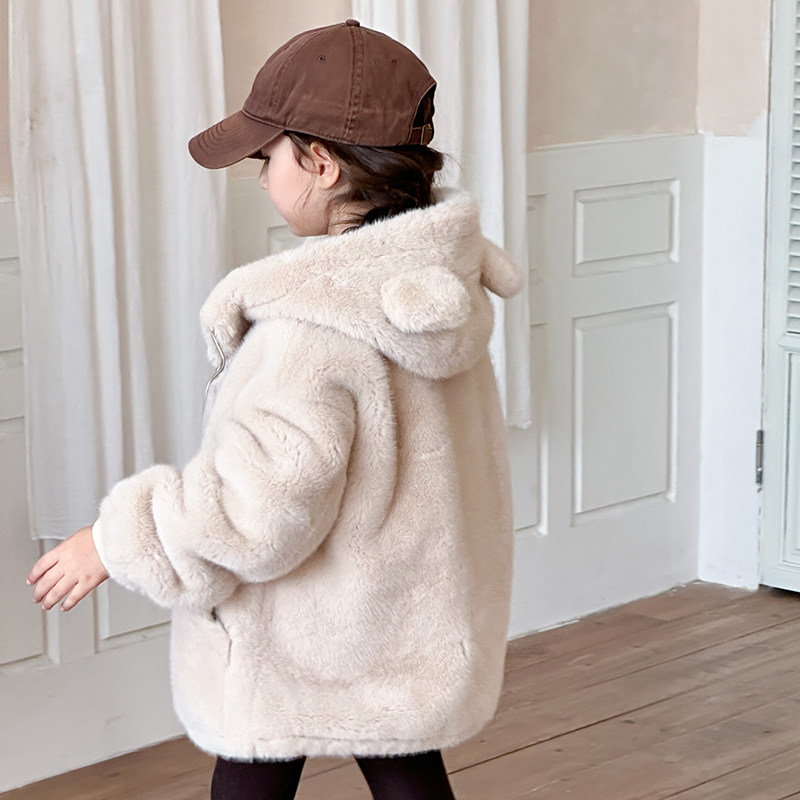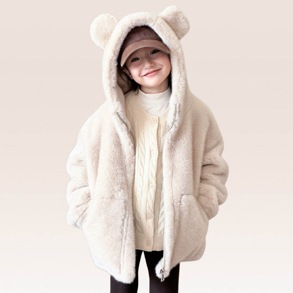 淘宝丹丹家皮草工厂批发,儿童皮草仿水貂毛可爱小熊连帽短款冬季宝宝毛毛外套童装男童女童