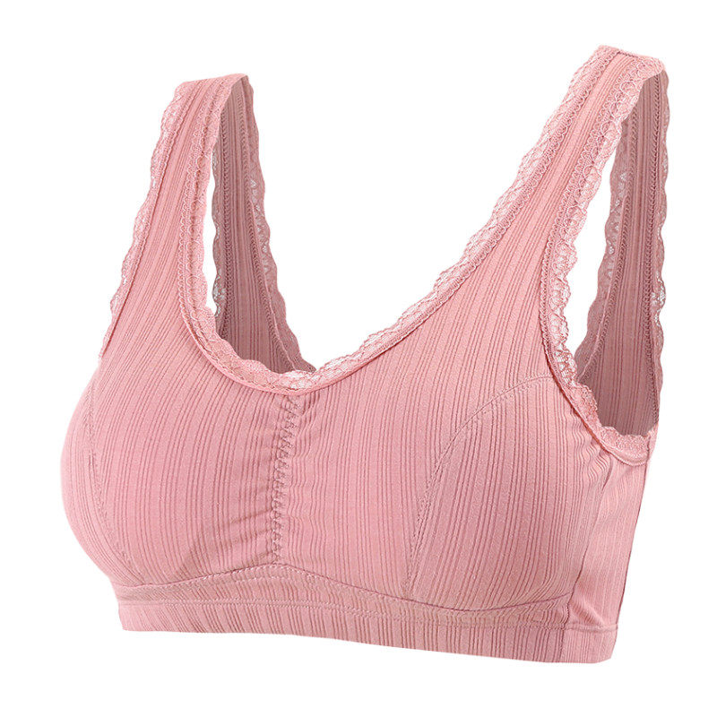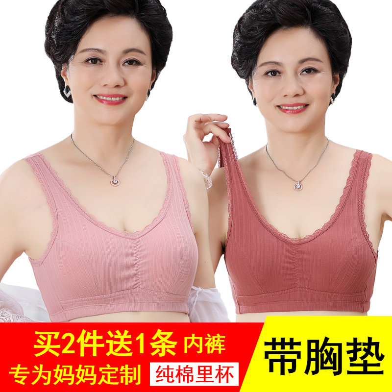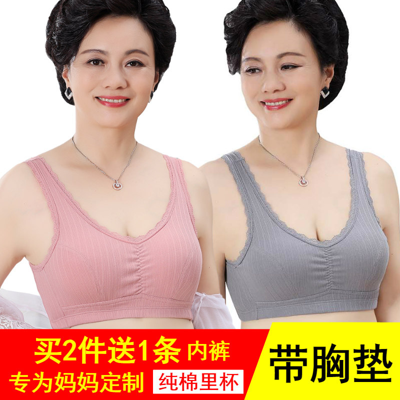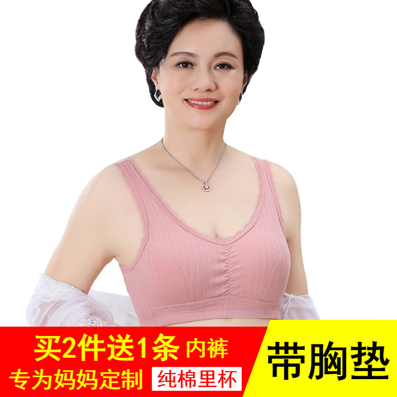 带胸垫背心纯棉无扣妈妈内衣文胸50岁中老年大码女无钢圈薄款胸罩