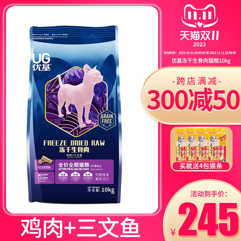 天猫宠易宠物用品专营店,优基10kg冻干生骨肉室内成幼猫猫粮,鸡肉+三文鱼
