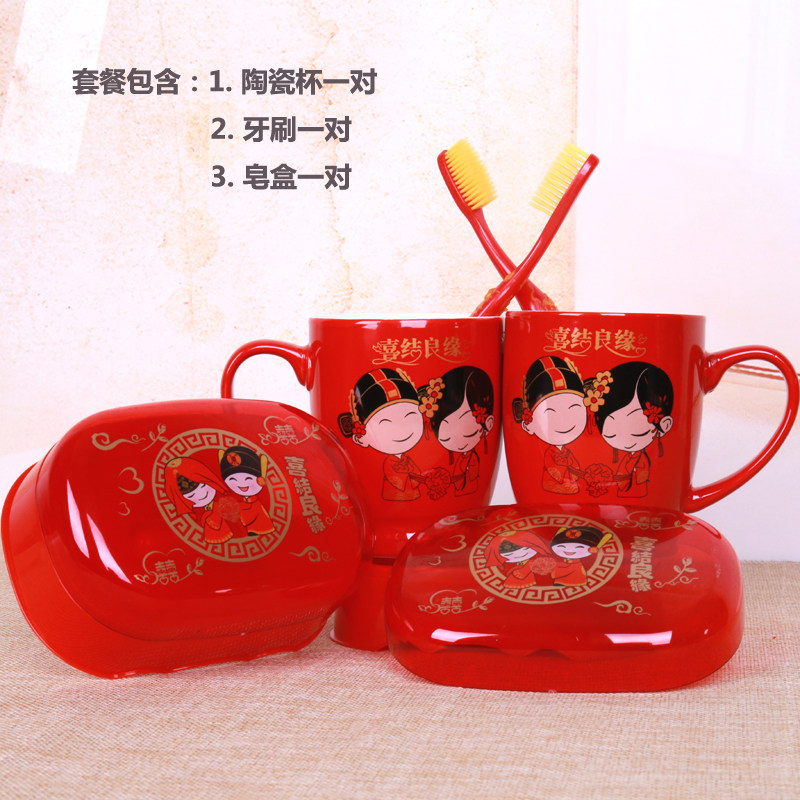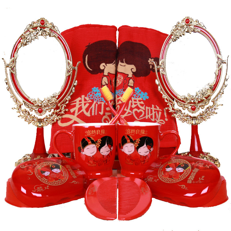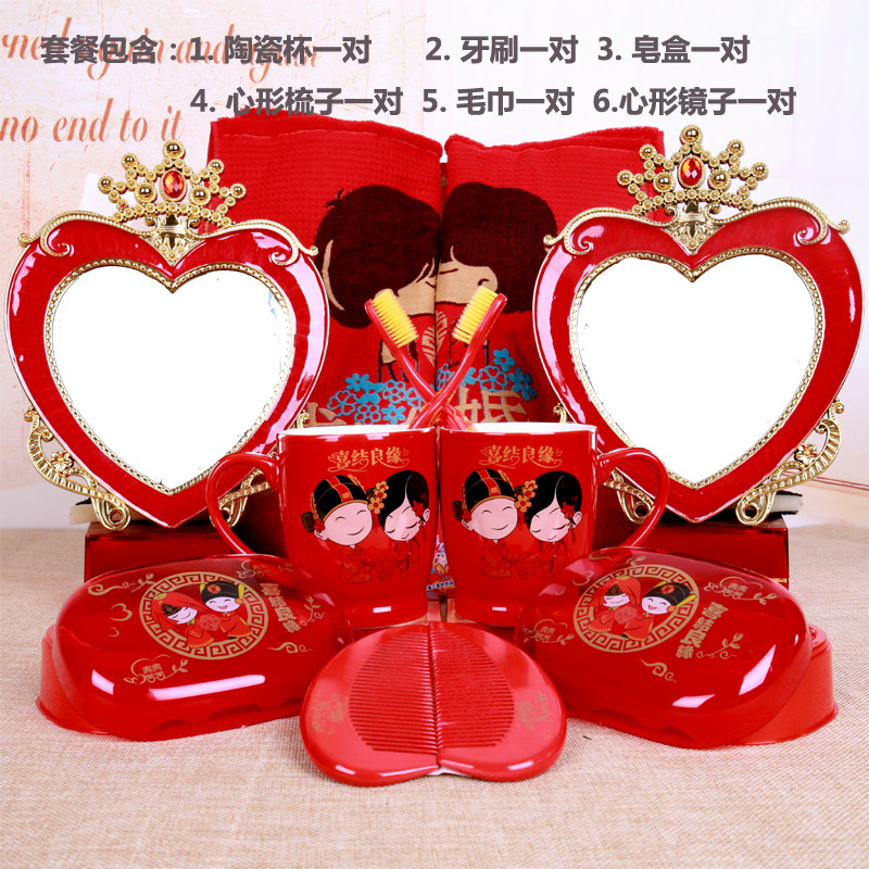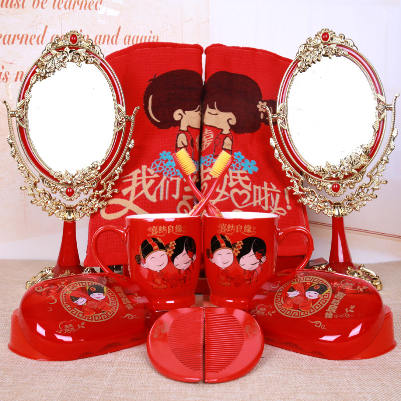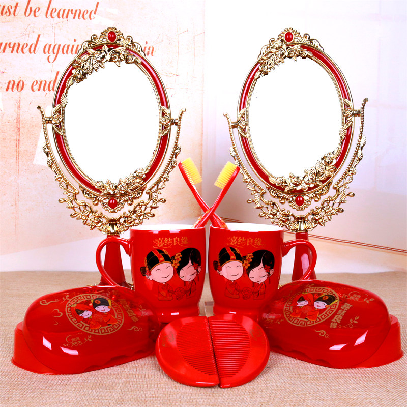 婚庆用品结婚新娘陪嫁镜子杯子皂盒牙刷毛巾喜盆女方嫁妆洗漱套装