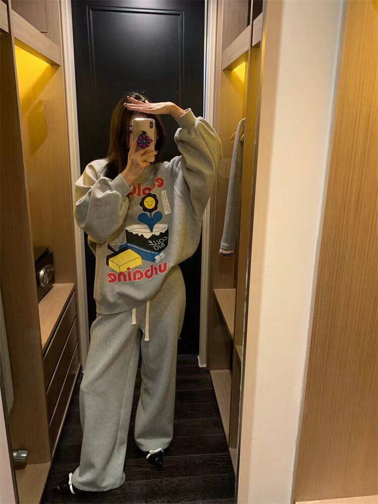 落落狷介 灰色运动服套装女卫衣套装圆领套头上衣+运动卫裤小个子