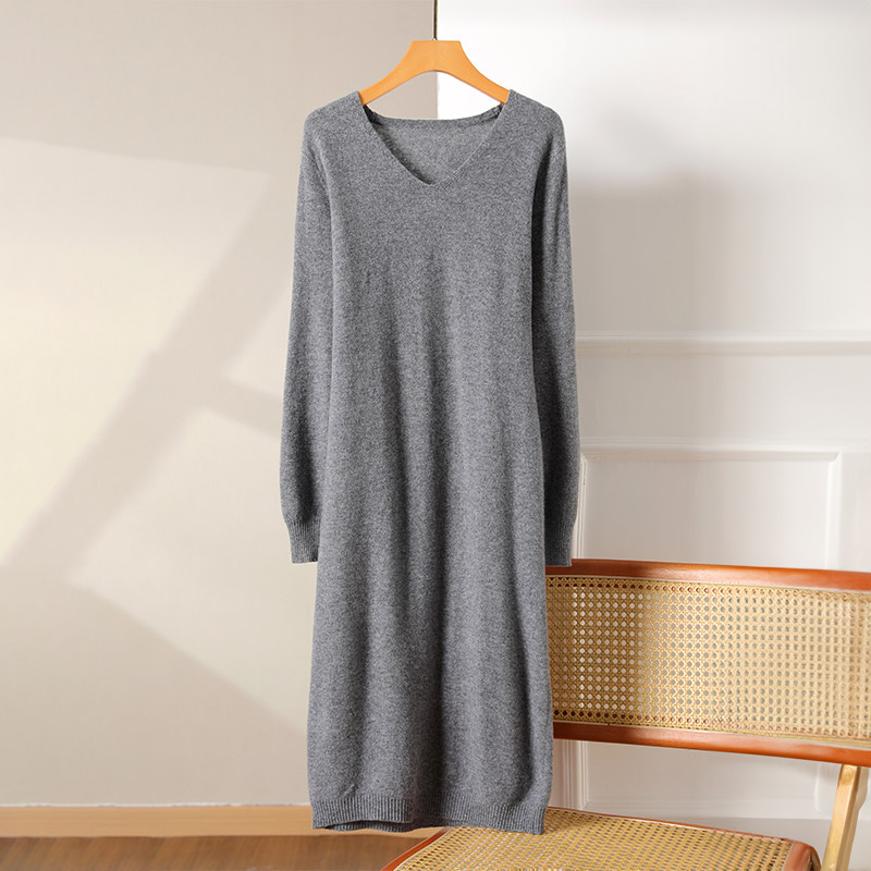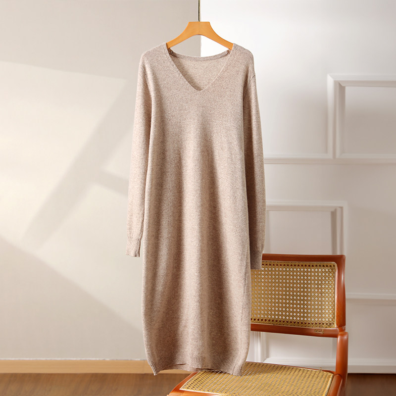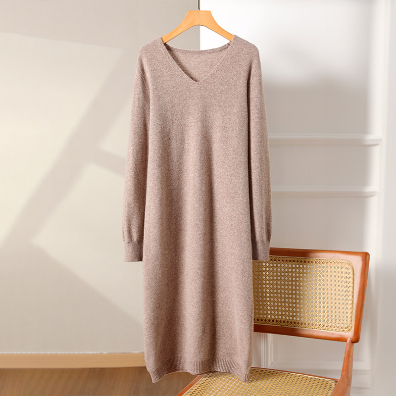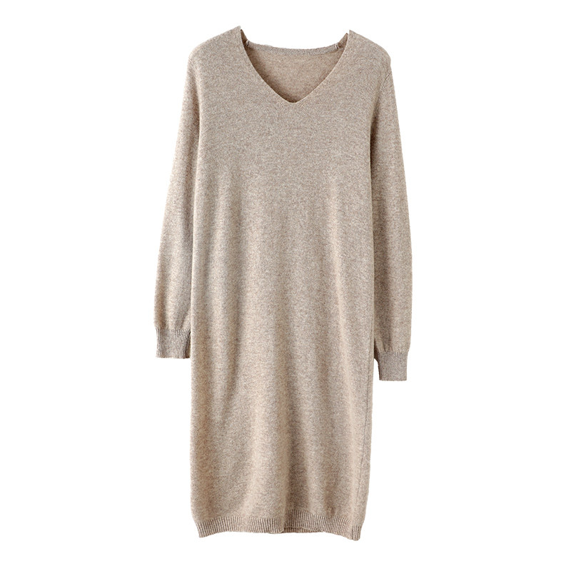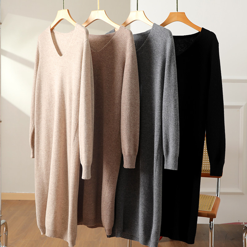 秋冬新款V领100%A类超柔纯羊毛衫女中长款连衣裙气质显瘦针织羊绒