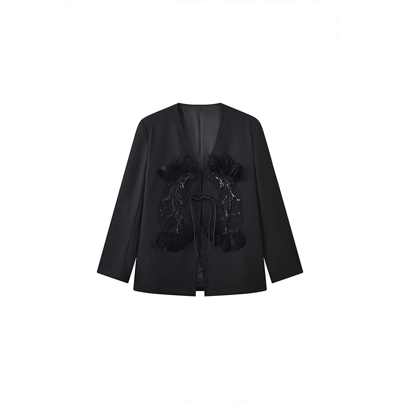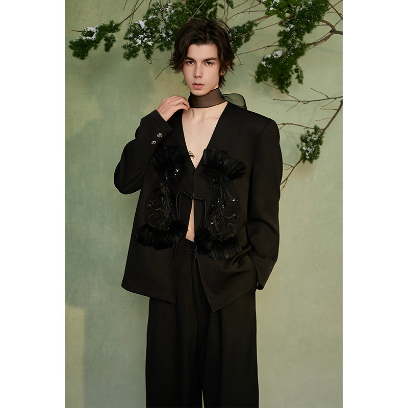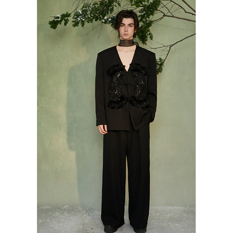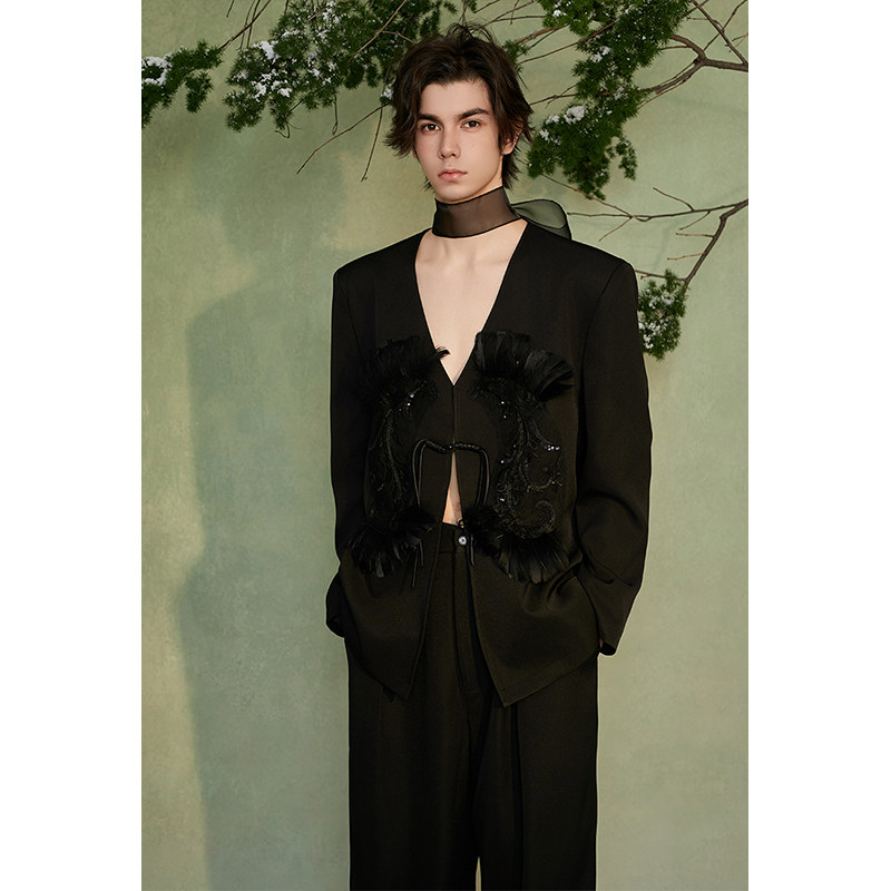 淘宝介伬JIECHI,介尺JIECHI「望舒秋豪」新中式贴花国风外套宽松无领盘扣西服上衣