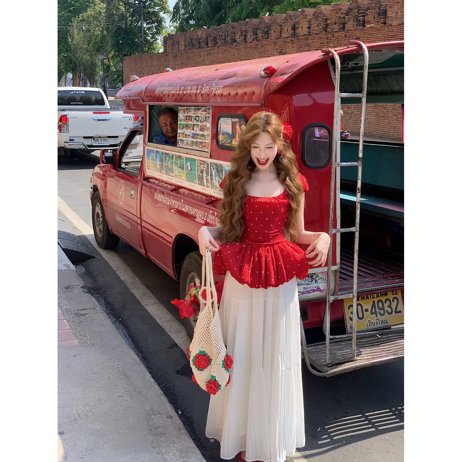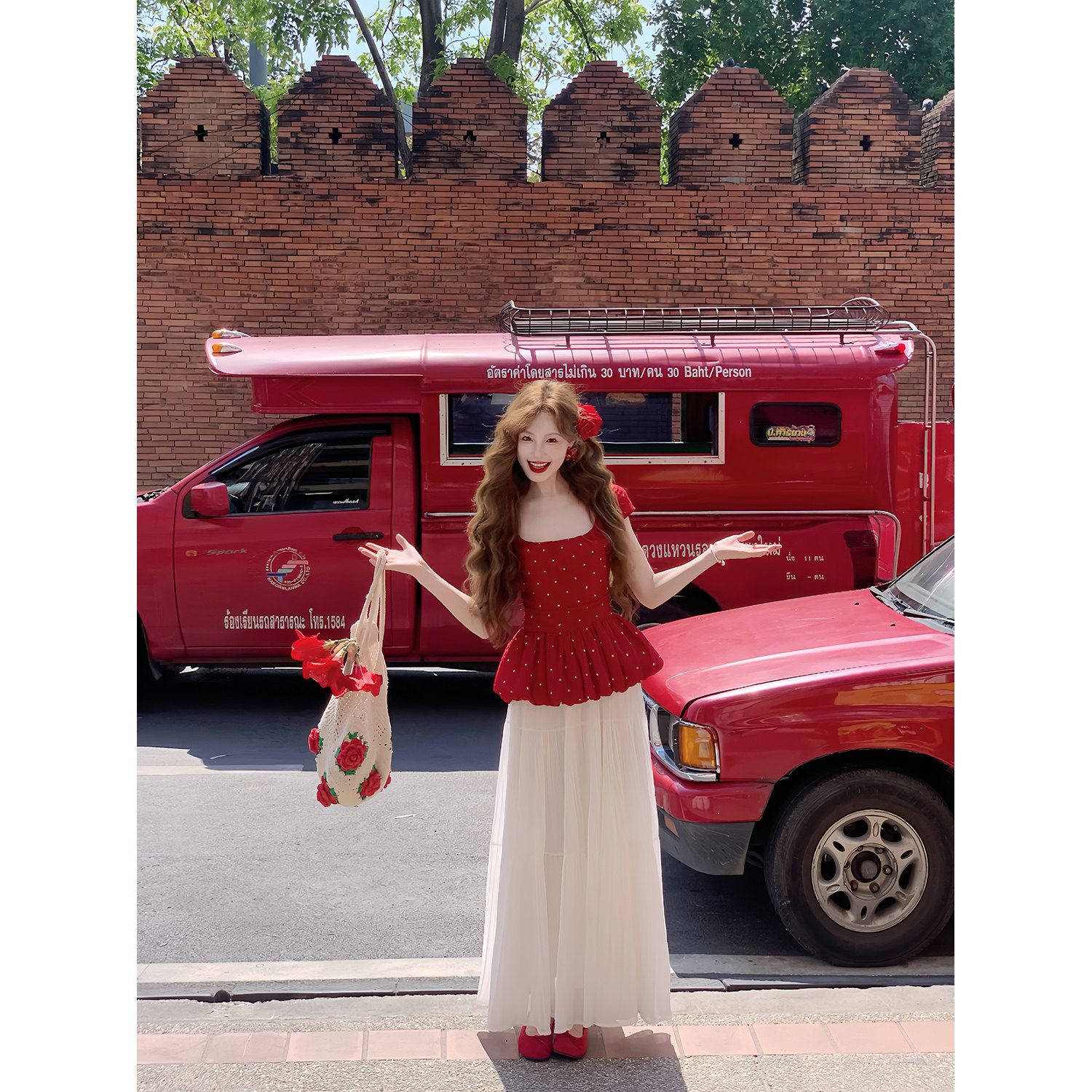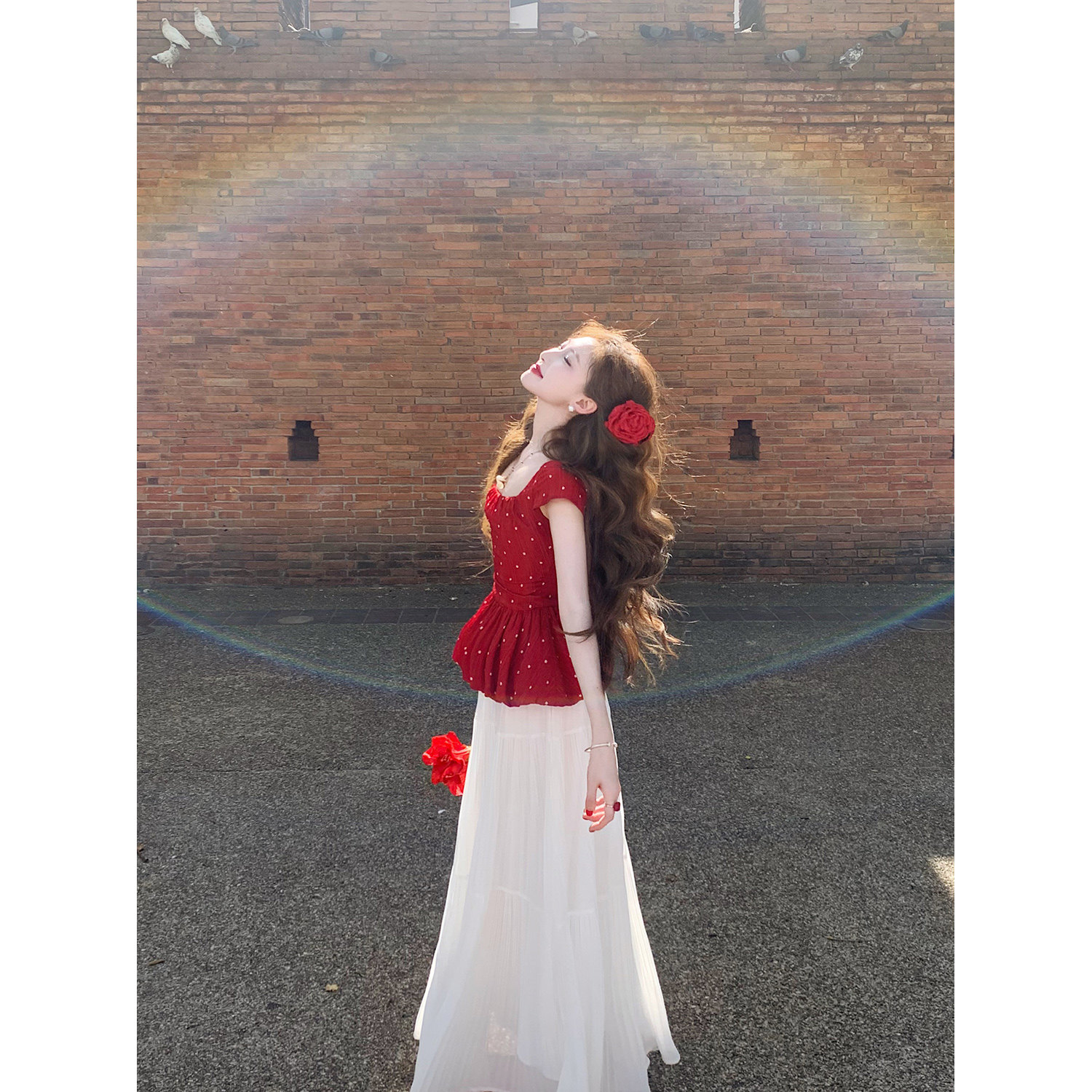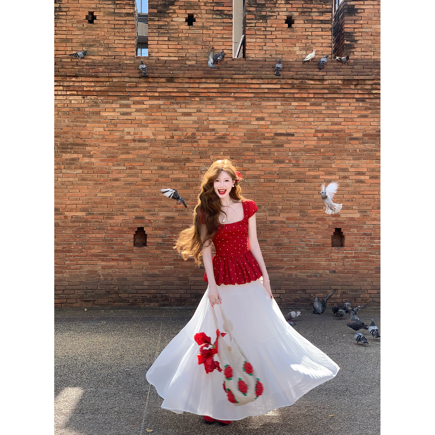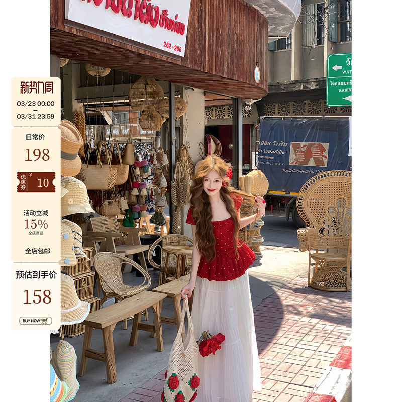 淘宝吃绿色菜,领10元券【草莓糖霜】法式方领收腰 红色花花波点小飞袖蓬蓬上衣