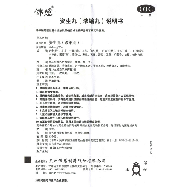 【佛慈】资生丸(浓缩丸)0.3g*200丸/盒