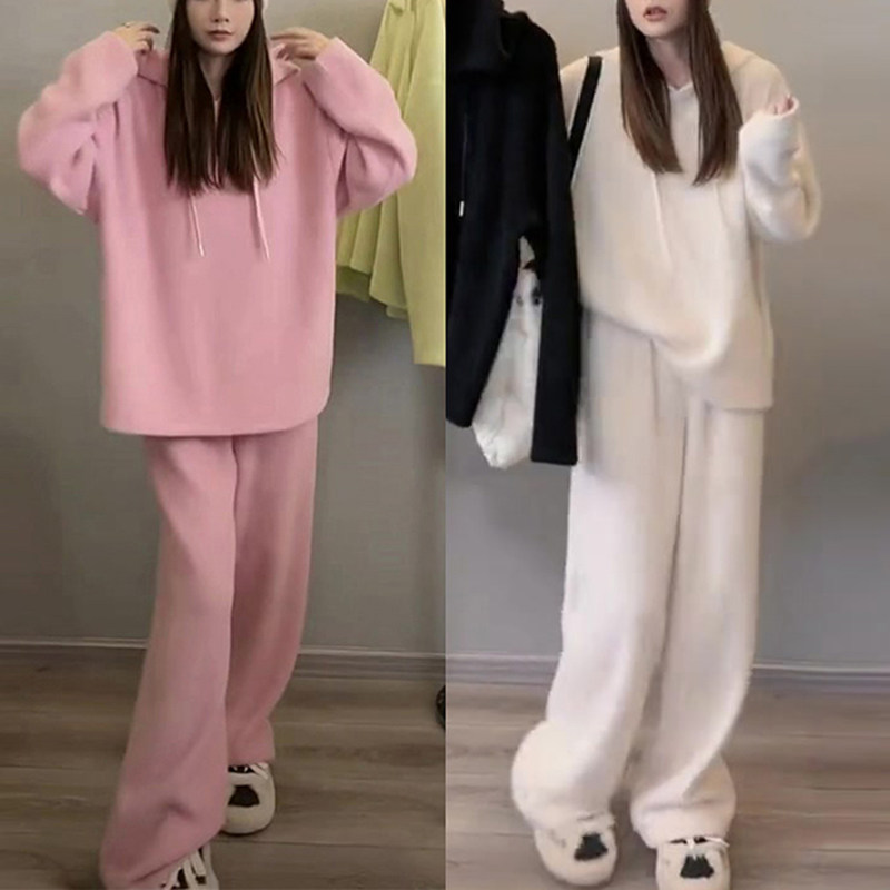 淘宝洁儿家欧韩潮流女装,2023冬装欧货卫衣套装女宽松加绒加厚连帽上衣休闲阔腿裤两件套潮