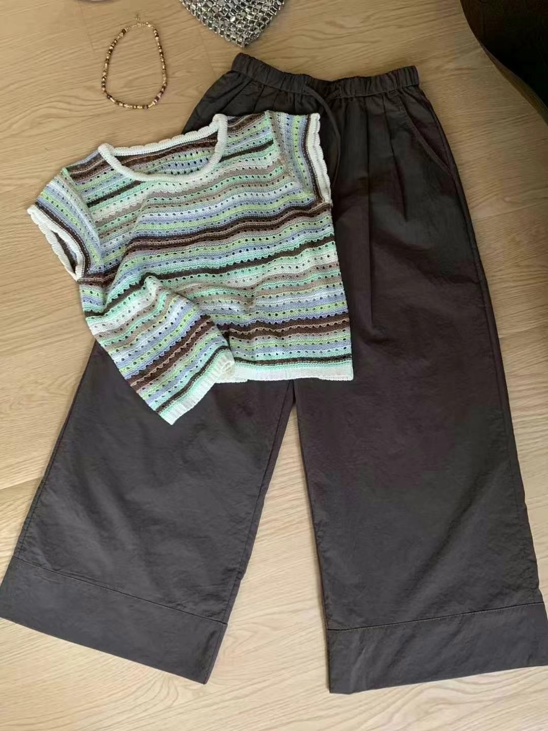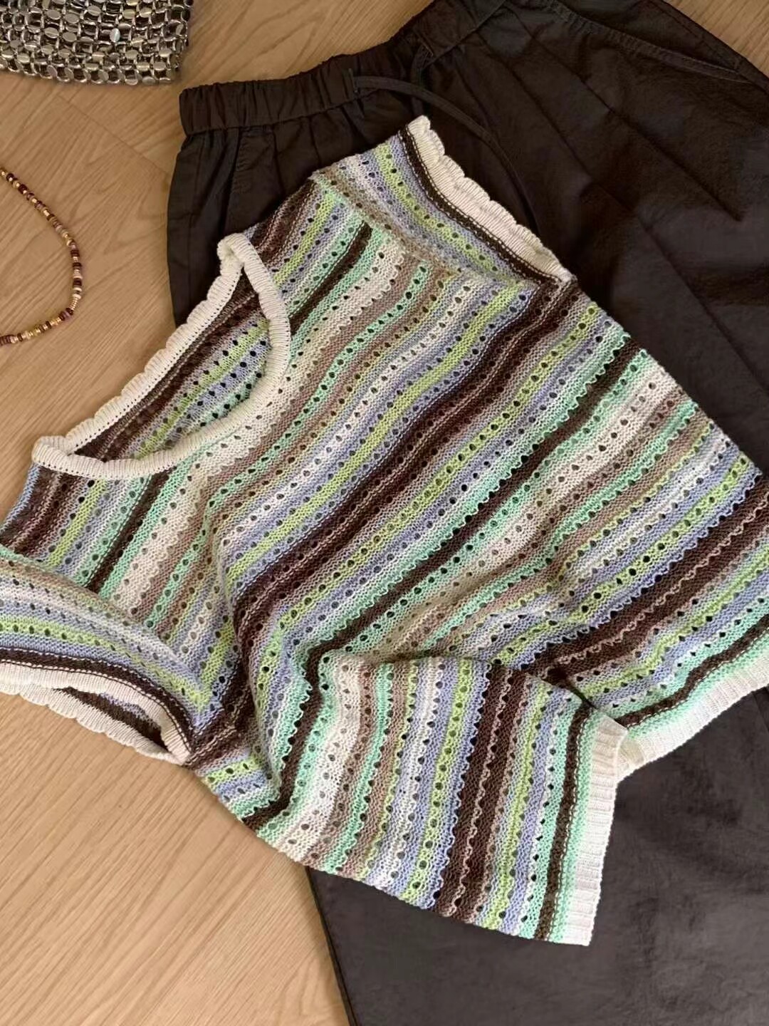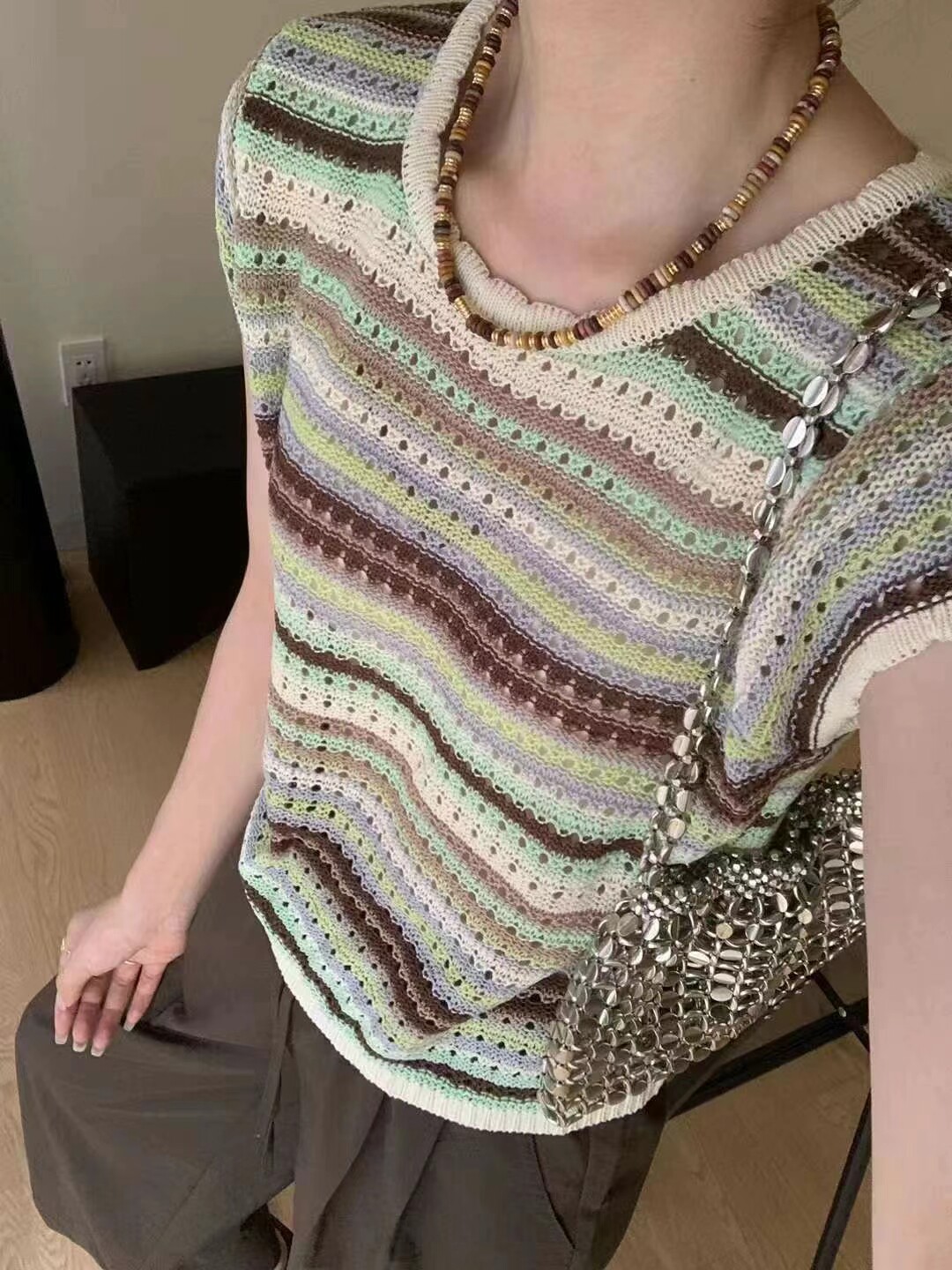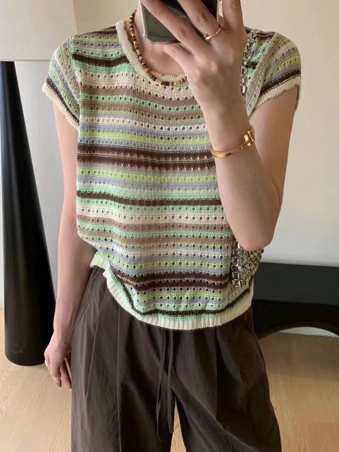 淘宝杭州四季青欧韩女装店,半袖冰丝T恤女欧洲站2024夏季新款欧货时尚镂空条纹亚麻针织衫女