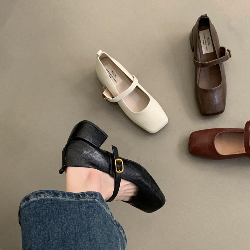 天猫淘工厂美妆直营,复古方头浅口粗跟单鞋女春秋新款法式晚风仙女软皮玛丽珍小皮鞋子