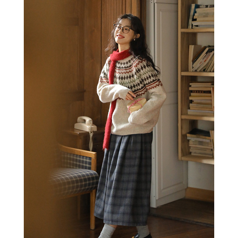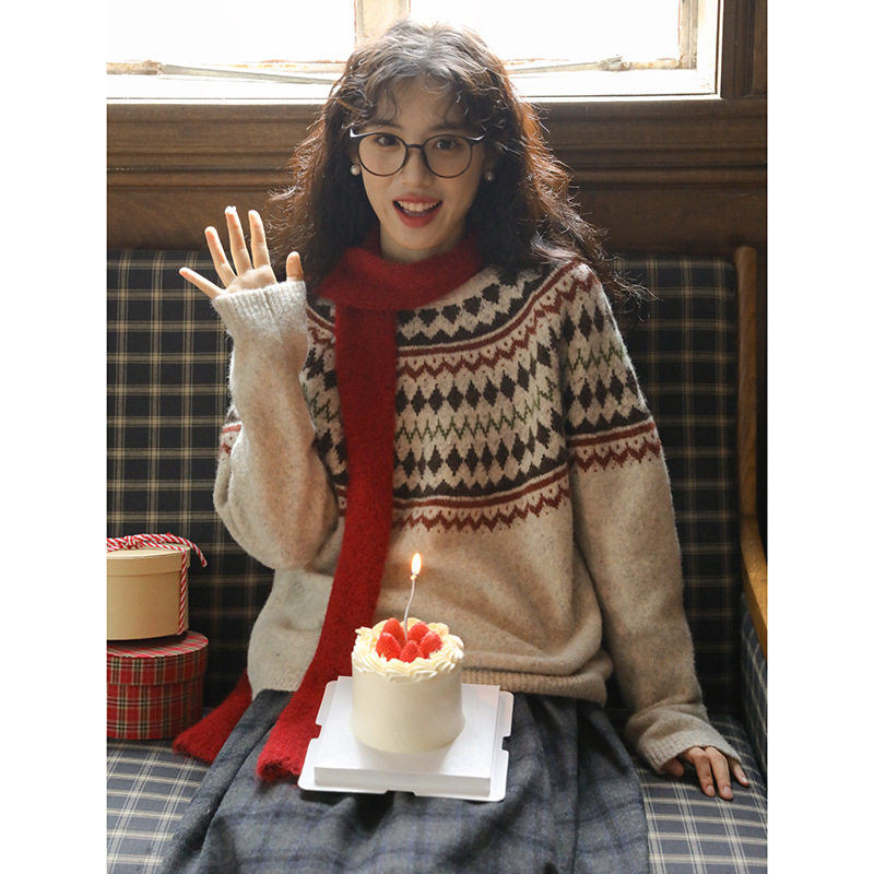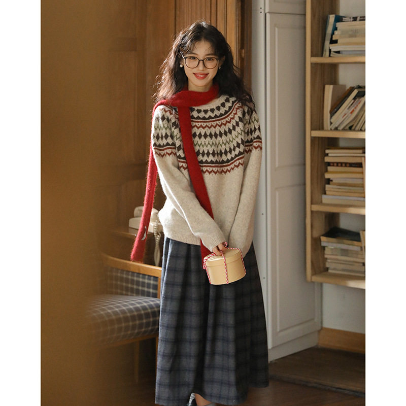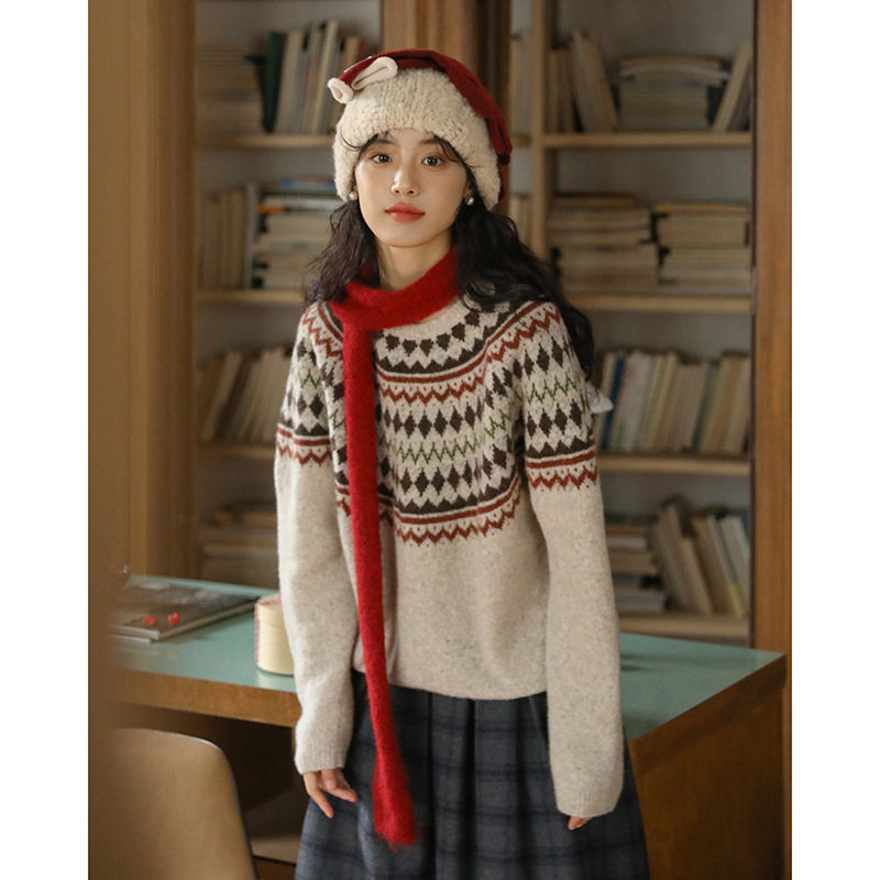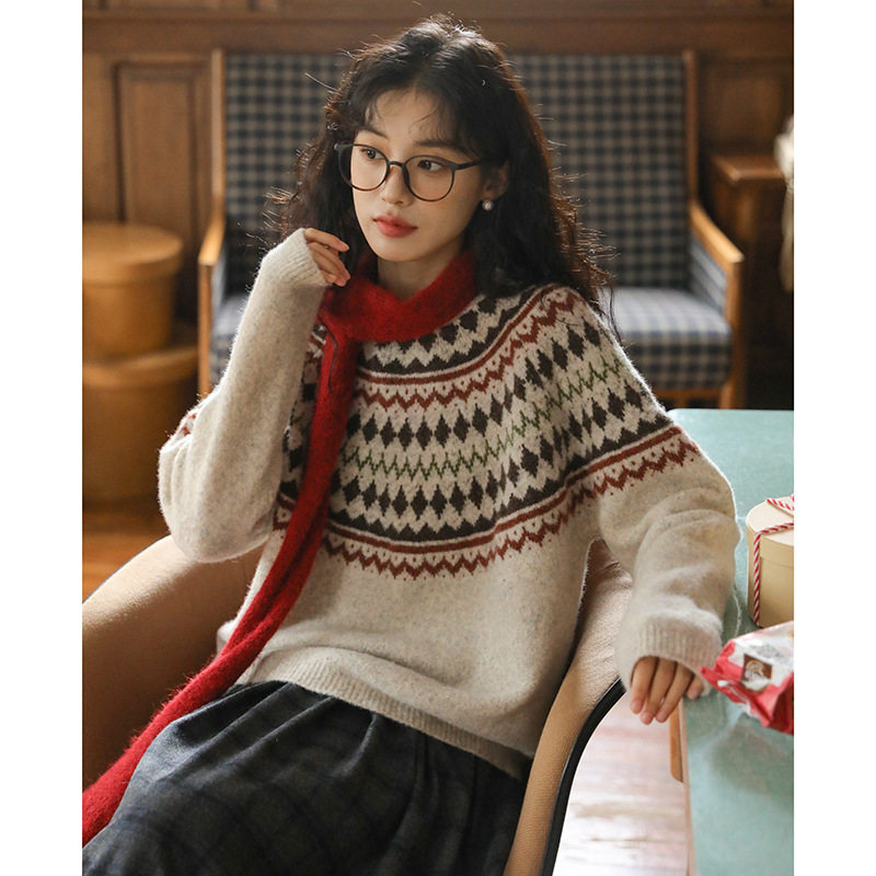 淘宝暖你一整天服装,2025冬季新款韩版复古慵懒费尔岛提花圆领软糯保暖套头长袖毛衣女