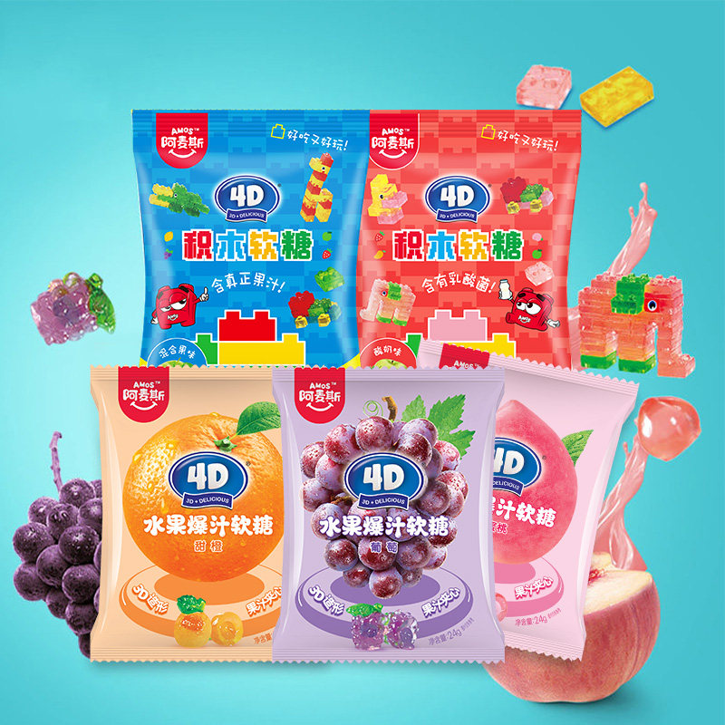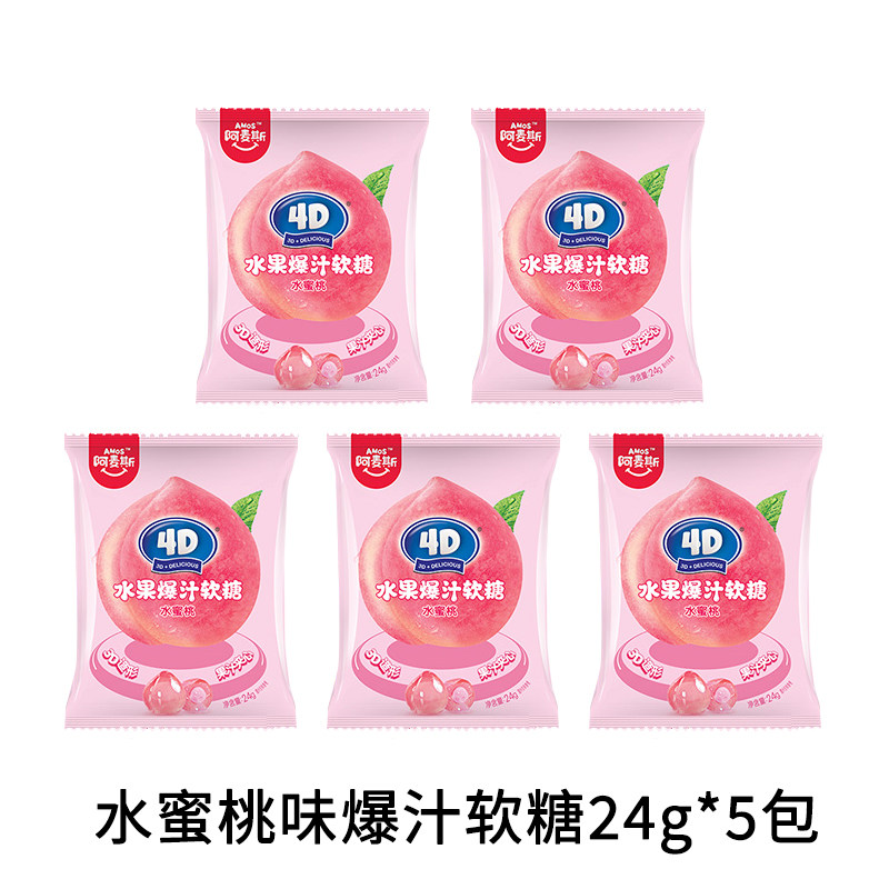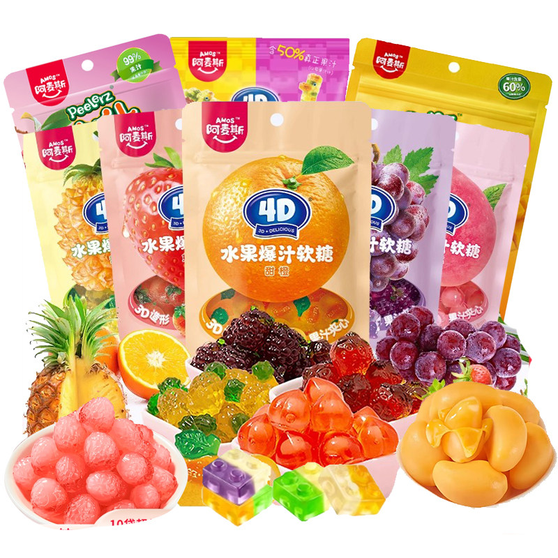 淘宝梓弈零食店,五连包阿麦斯4d果味软糖爆浆爆汁水果汁夹心软糖零食橡皮糖QQ糖果