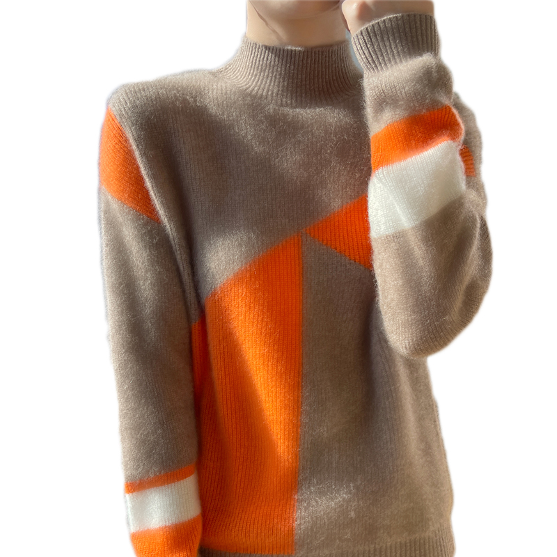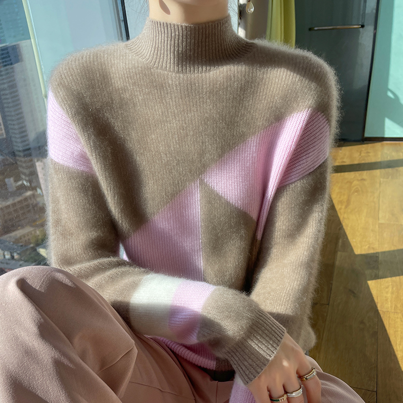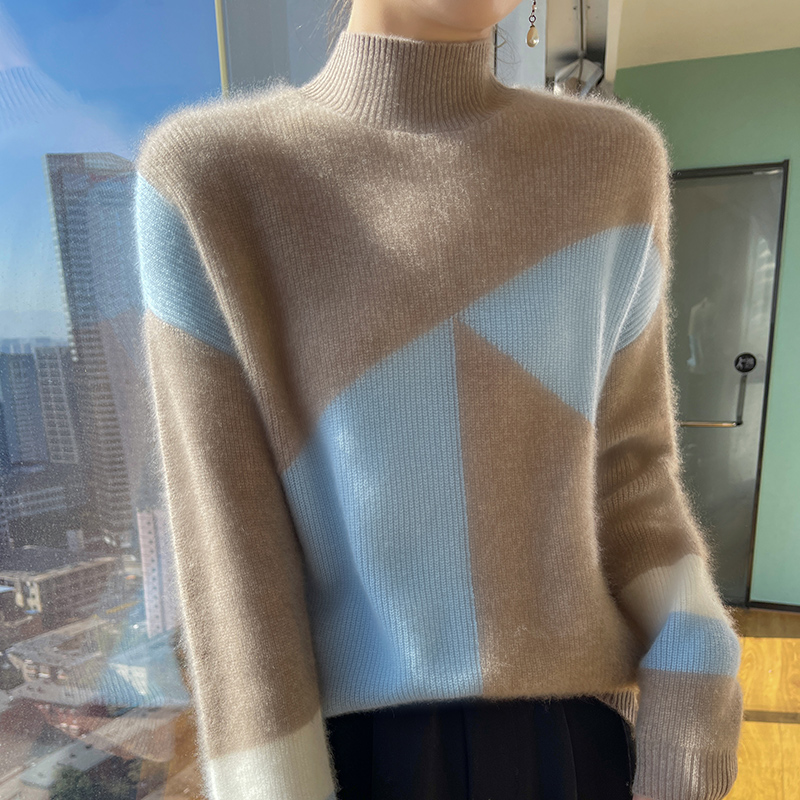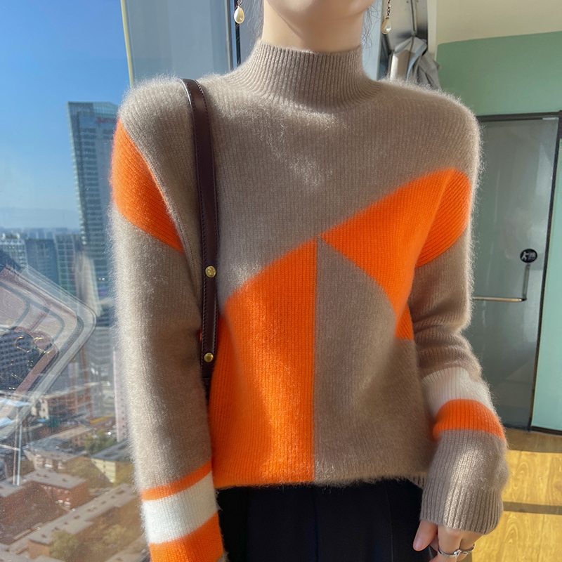 淘宝梦茜韵高端羊绒衫工厂直销店,半高领拼色100%纯羊毛衫加厚毛衣