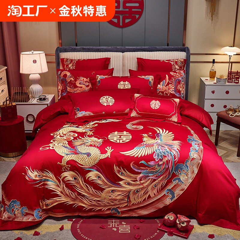 天猫天天特卖食品直营,全棉高端婚庆刺绣大红四件套多件套纯棉轻奢中式婚礼嫁娶喜庆床品