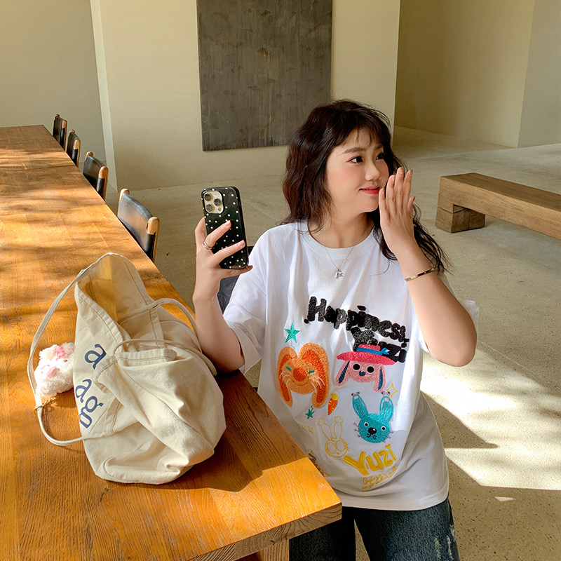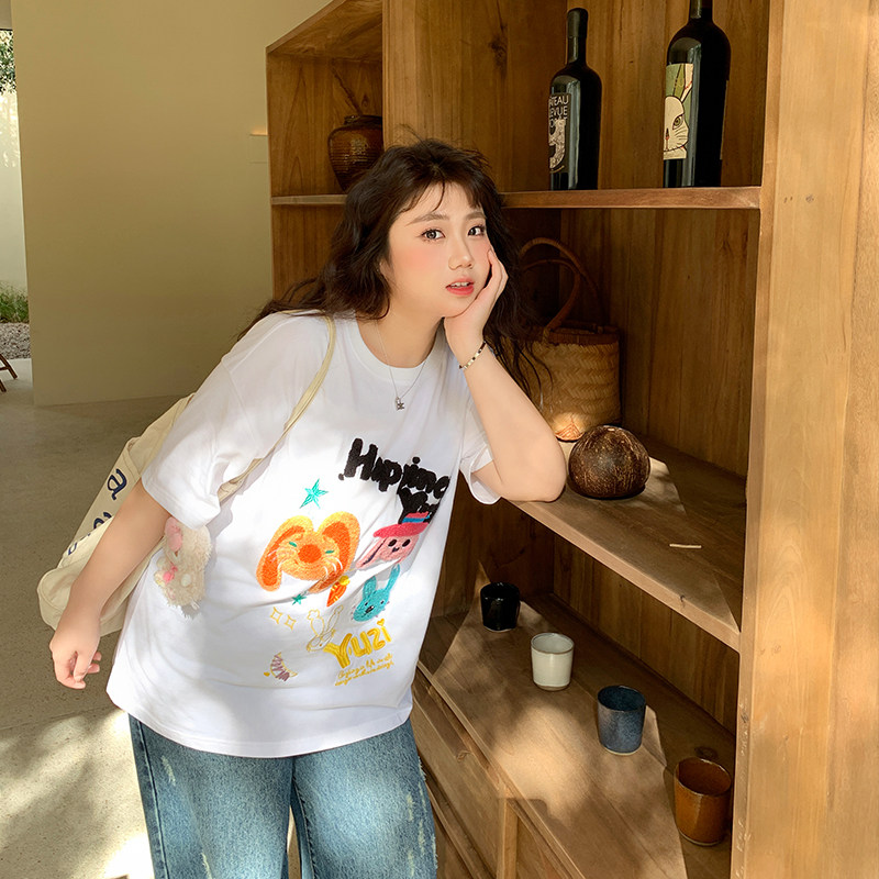 YUZI鱼子上衣T恤刺绣可爱大码女装微胖mm妹显瘦遮肉200斤百搭舒适