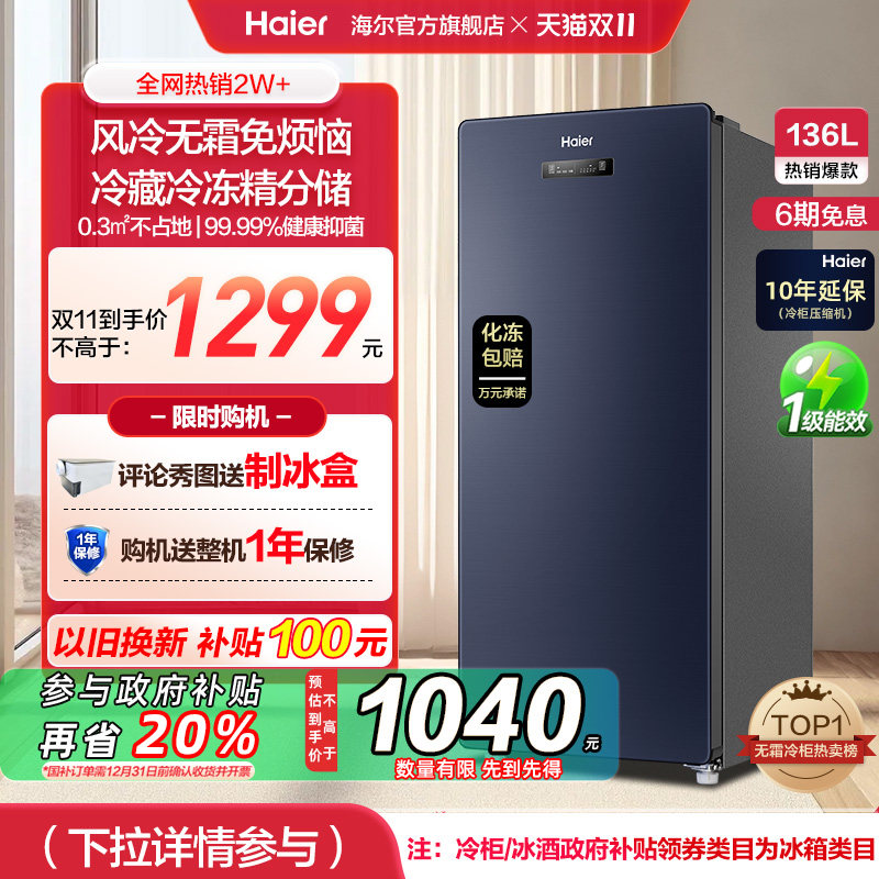 天猫海尔官方旗舰店,海尔136升家用抽屉小冰柜无霜,风冷无霜/N-AB巡航抑菌/立式抽屉精致分储