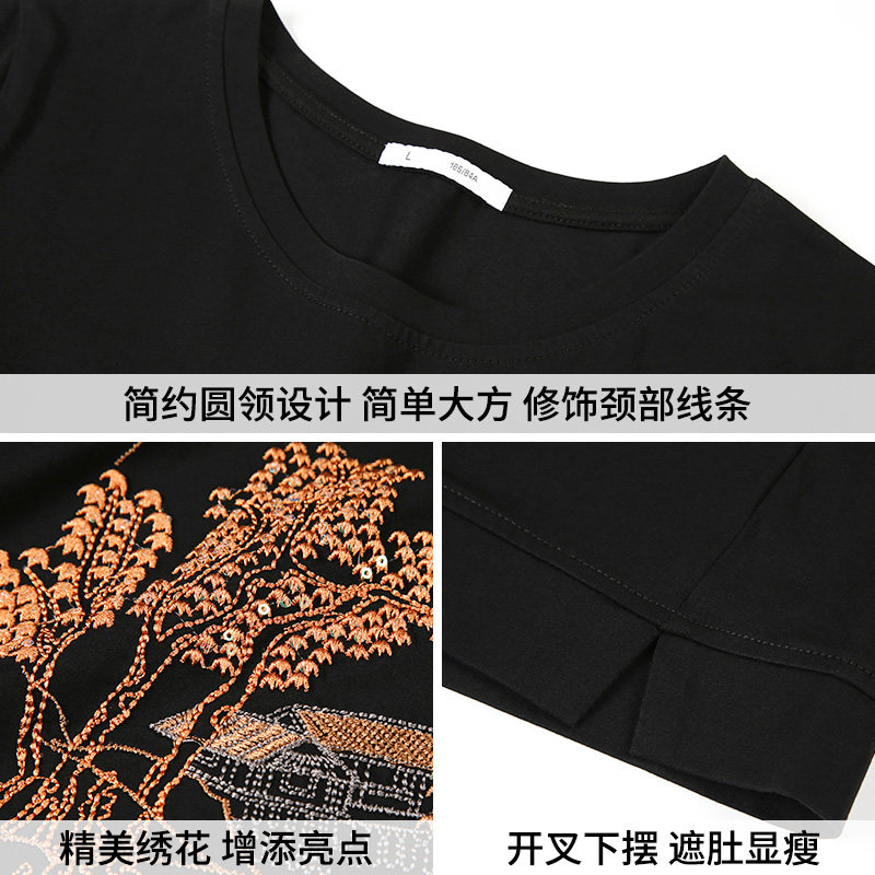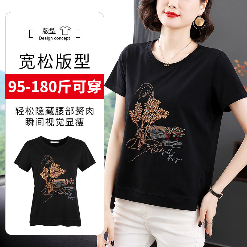 天猫法美丽旗舰店,女纯棉短袖宽松夏装2022年新款t恤,精美绣花 遮肚显瘦