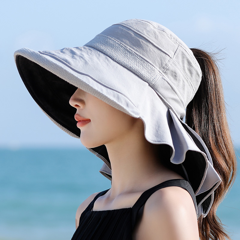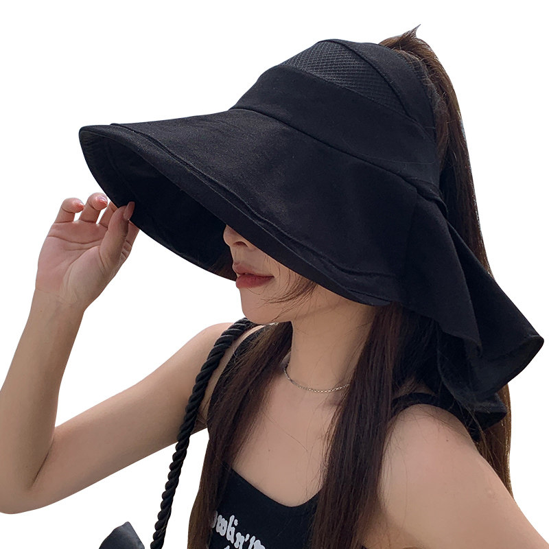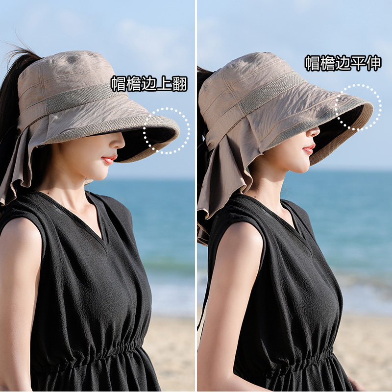 护脖颈帽子女夏大檐遮脸防晒帽休闲遮阳太阳帽扎马尾轻薄透气凉帽
