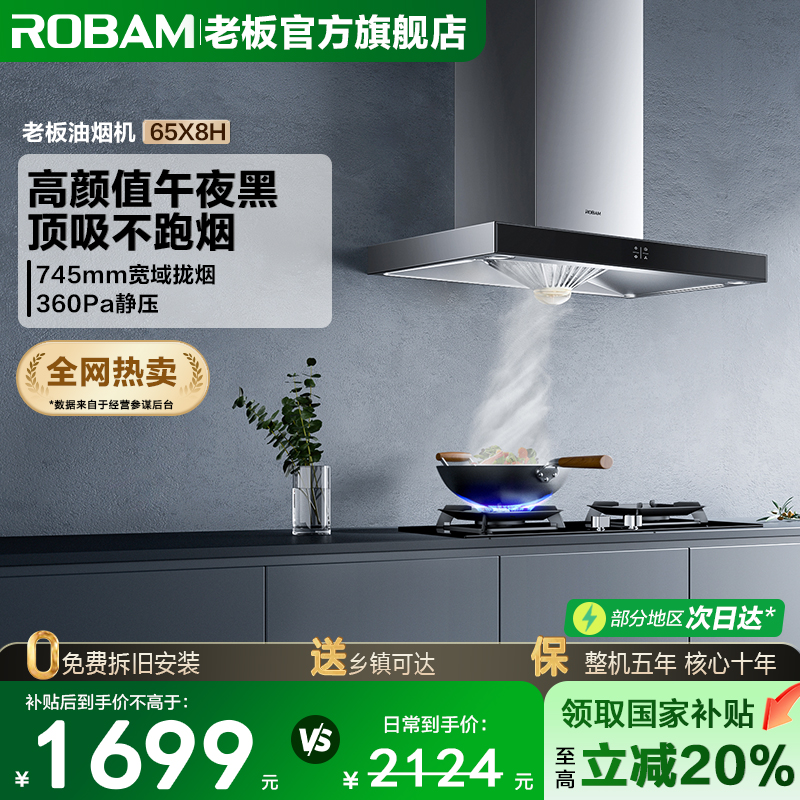 天猫老板烟灶旗舰店,老板智能油烟机65X8H下单享礼,免拆洗高效拢烟410pa静压智能大吸力油烟机