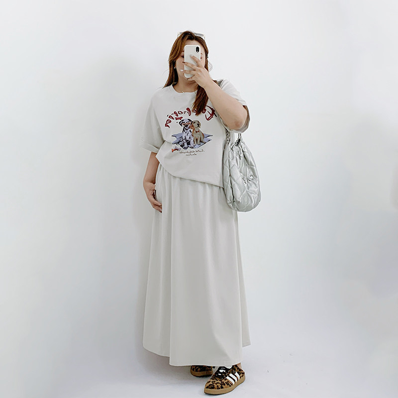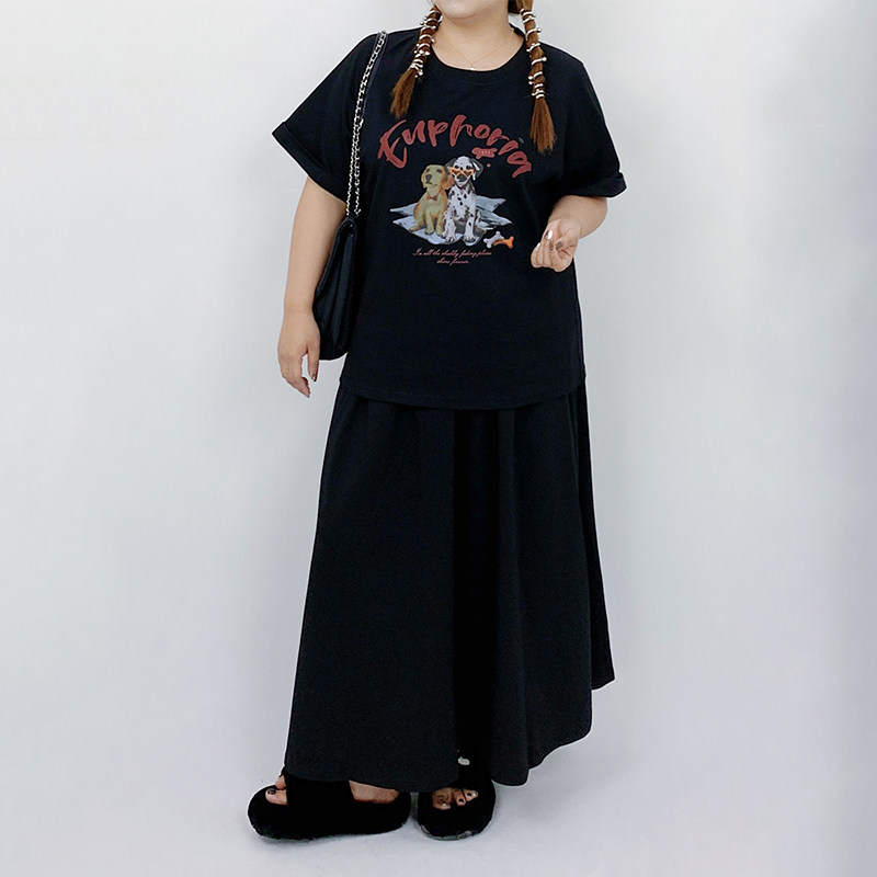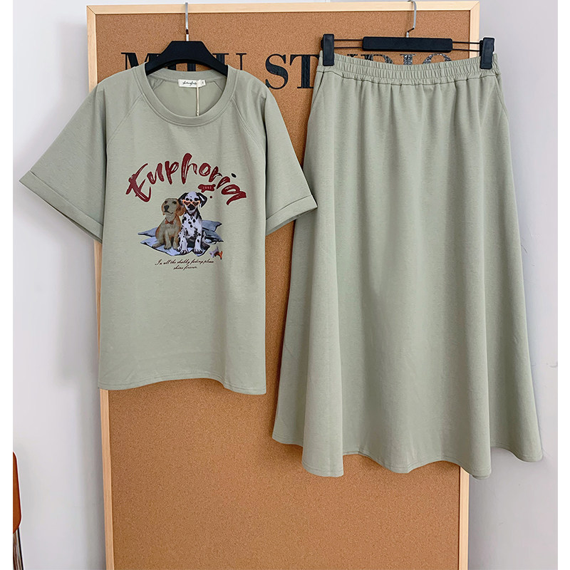 Milu家大码女装夏美式印花休闲宽松短袖t恤a字半身裙胖mm显瘦套装