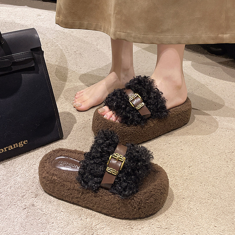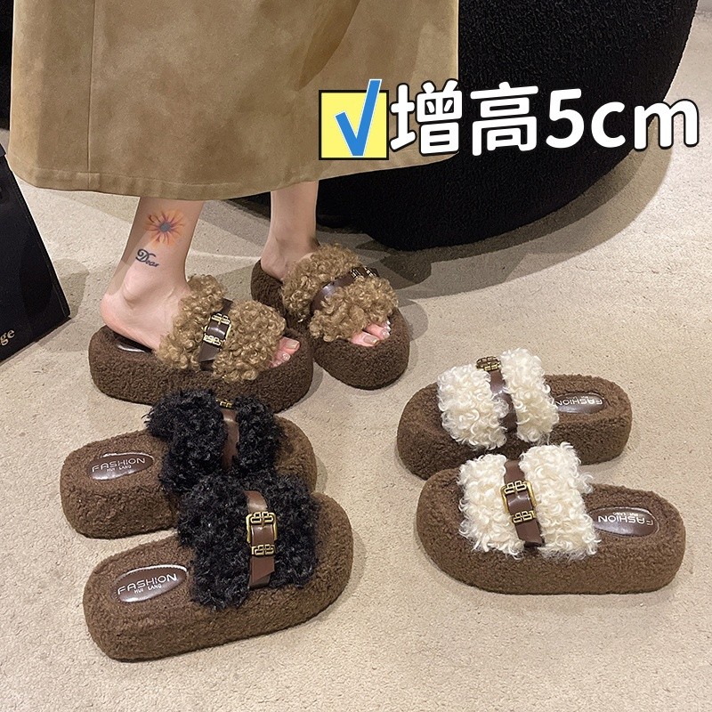 天猫淘工厂美妆直营,厚底高级感毛毛拖鞋女外穿2025新款秋冬小个子时尚百搭保暖棉拖鞋