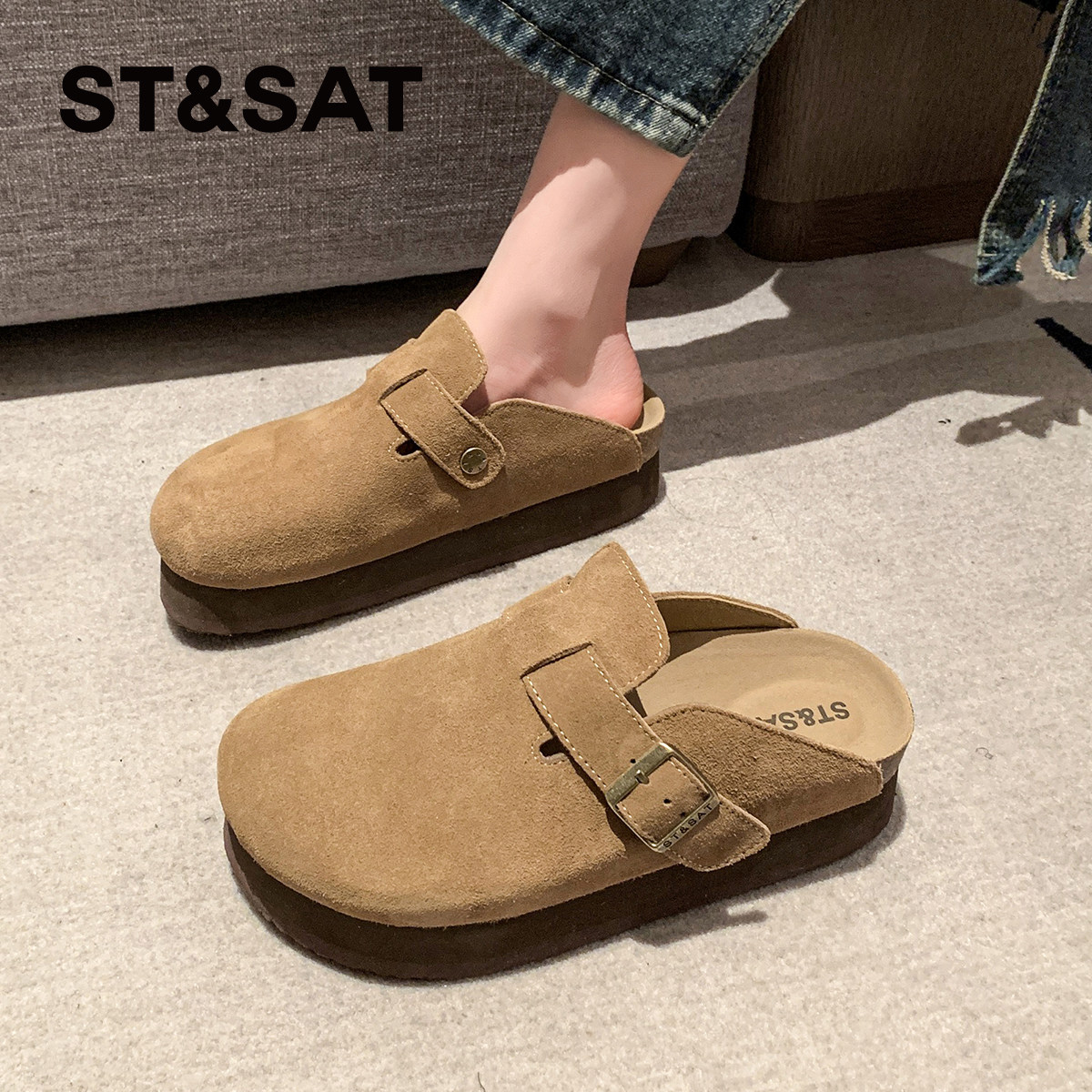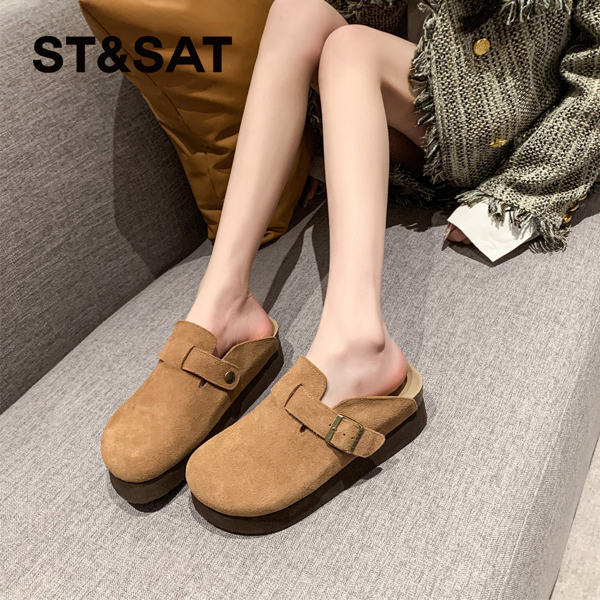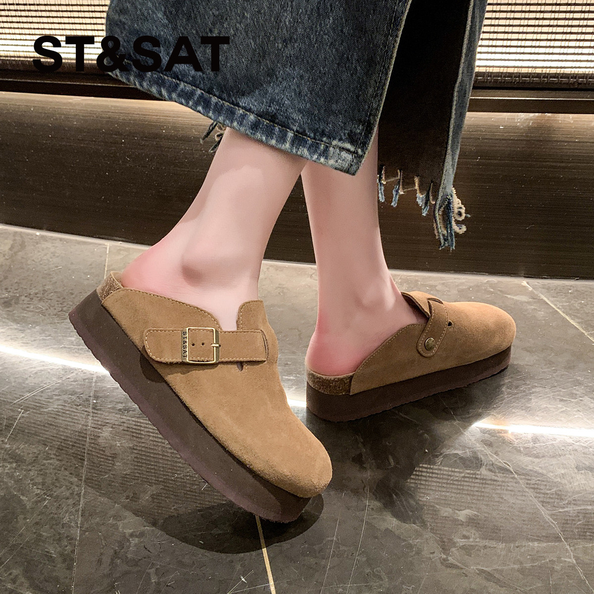 天猫星期六官方旗舰店,星期六真皮5cm松糕底勃肯鞋半拖女2024秋冬新款小个子增高包头拖