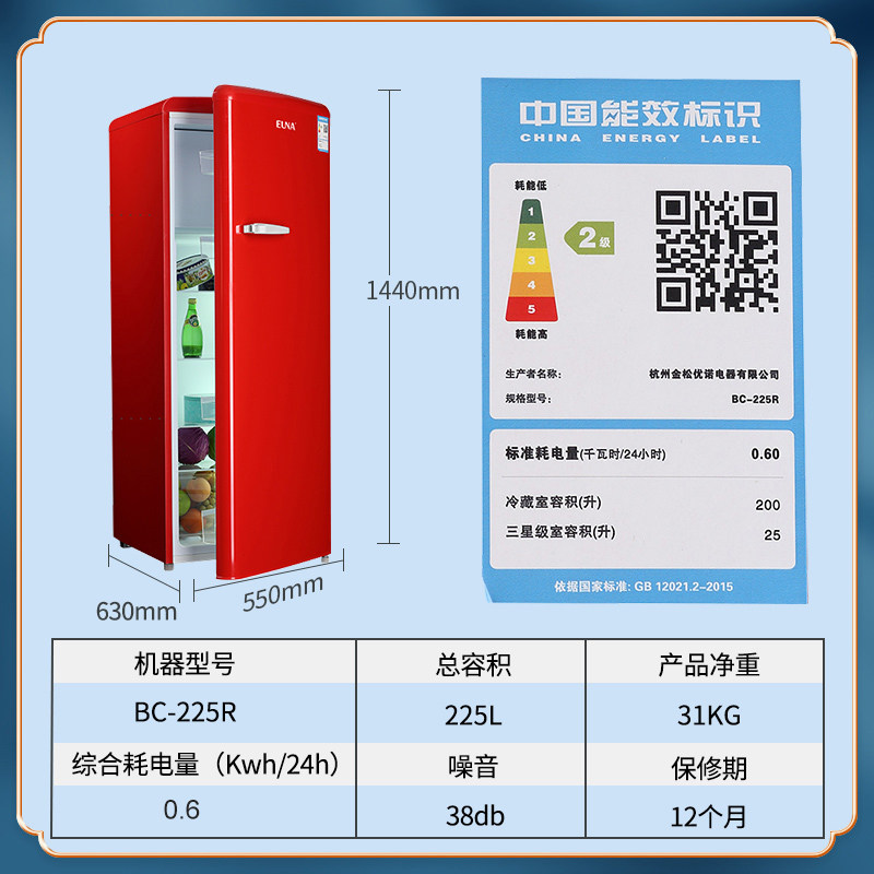 天猫EUNA云小象专卖店,euna /优诺bc-225r单门复古冰箱,冷藏冷冻 圆润设计 复古颜值 赠品三选一