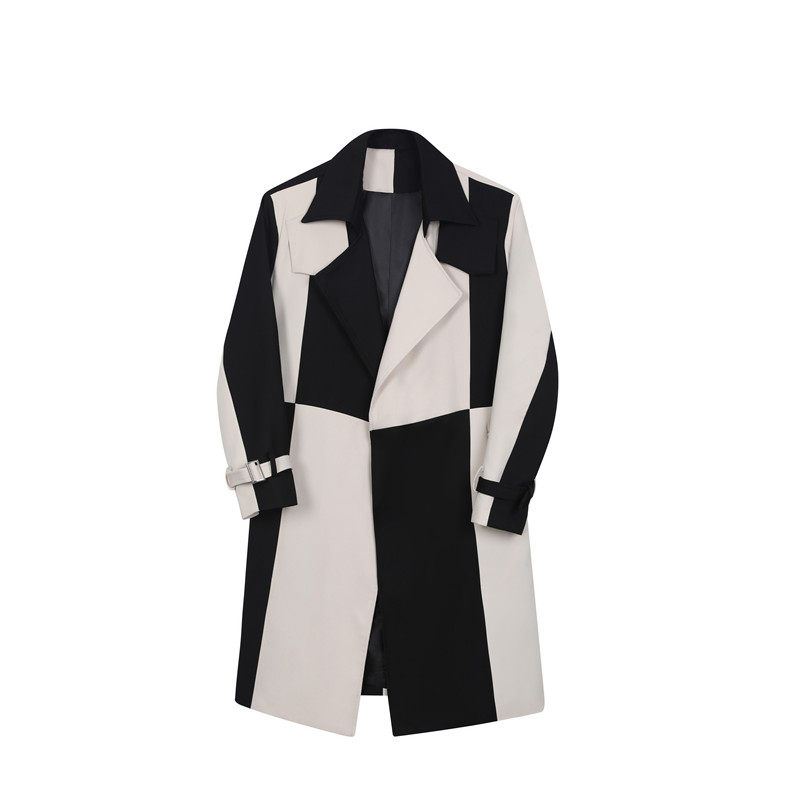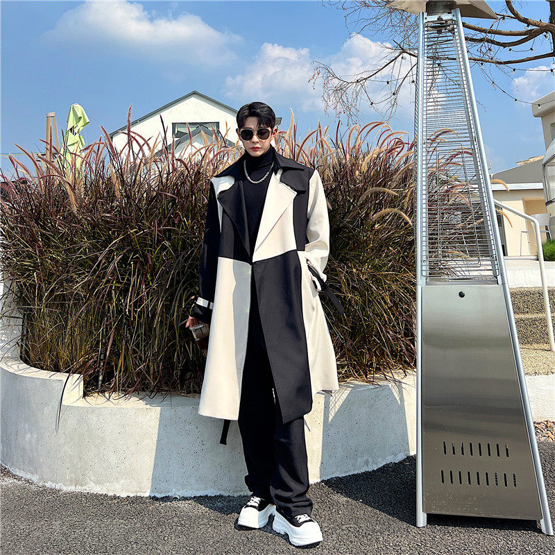 淘宝小柒家潮流男装,秋冬款小众不对称撞色风衣男设计感韩版时髦痞帅网红过膝加厚外套
