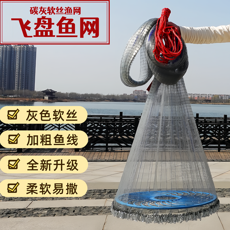 碳灰加粗软丝渔网飞盘撒网飞盘式手抛网捕鱼网易抛网圆盘甩网捞鱼