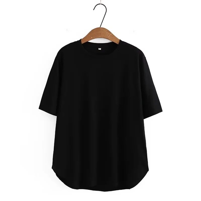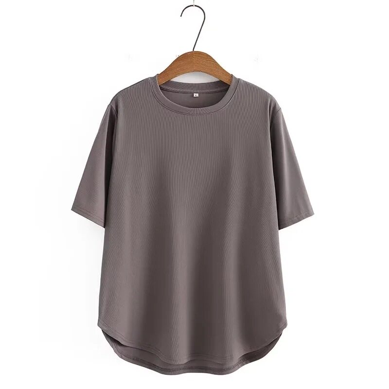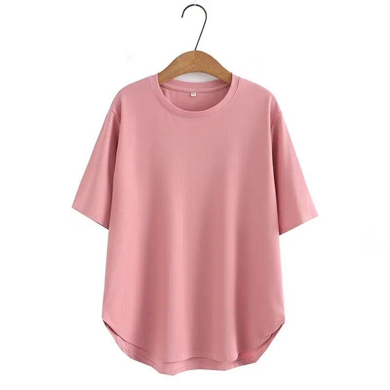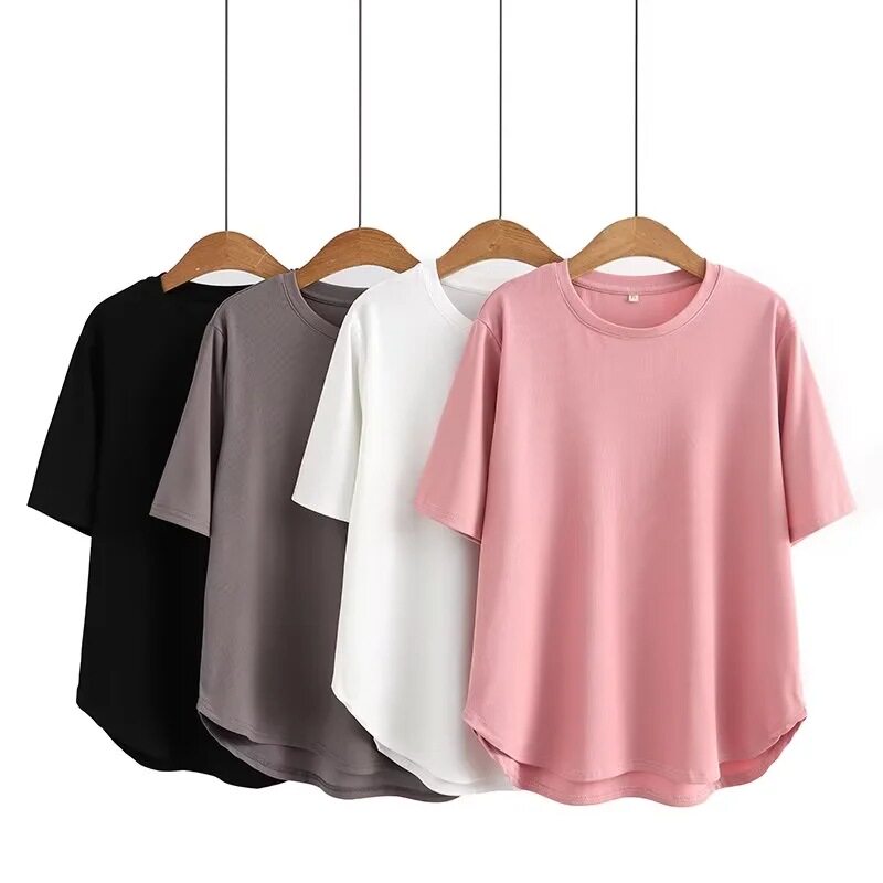 M大码女装春夏装宽松圆领弧形下摆罗文弹力简单体恤103胖MM加大码