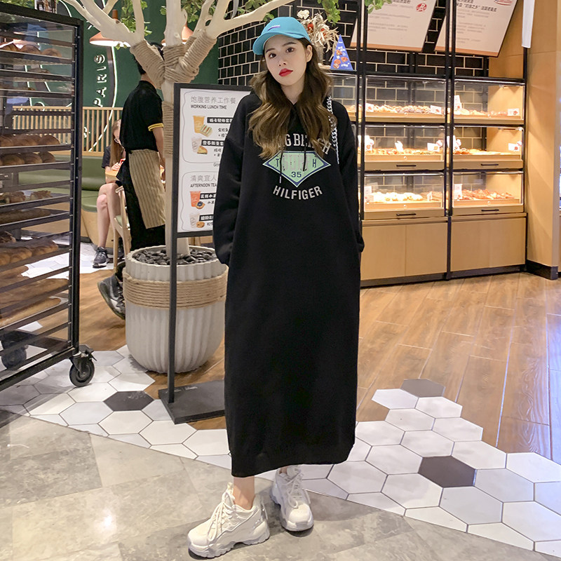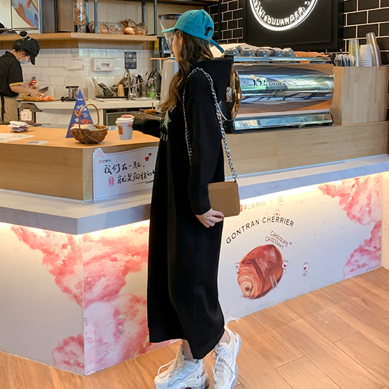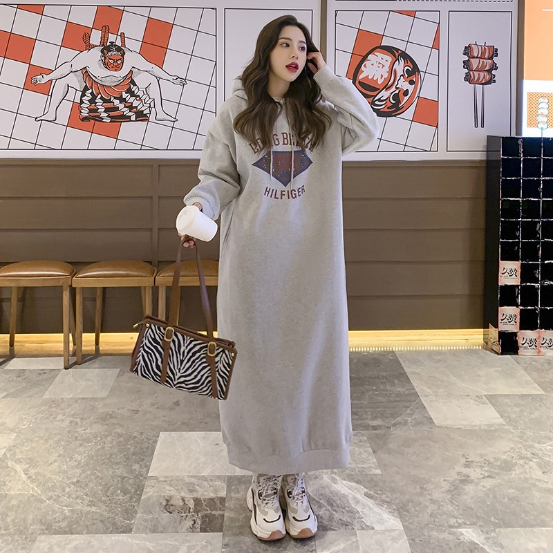 超长款过膝加绒加厚连帽卫衣女2023年秋冬新款宽松大码卫衣连衣裙