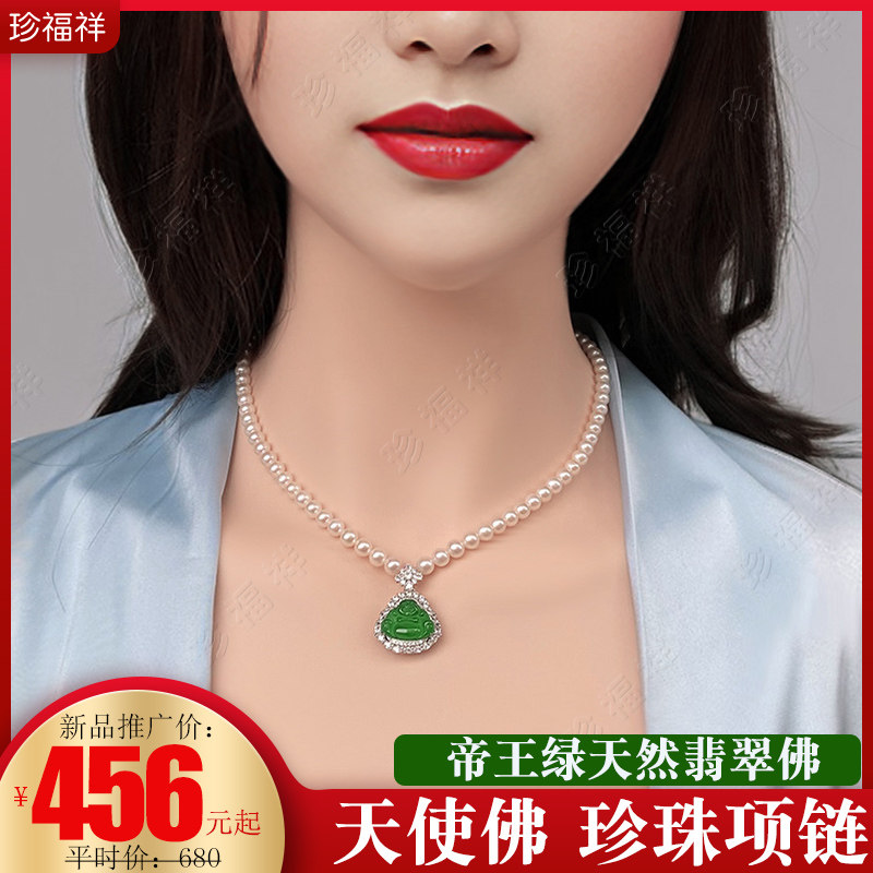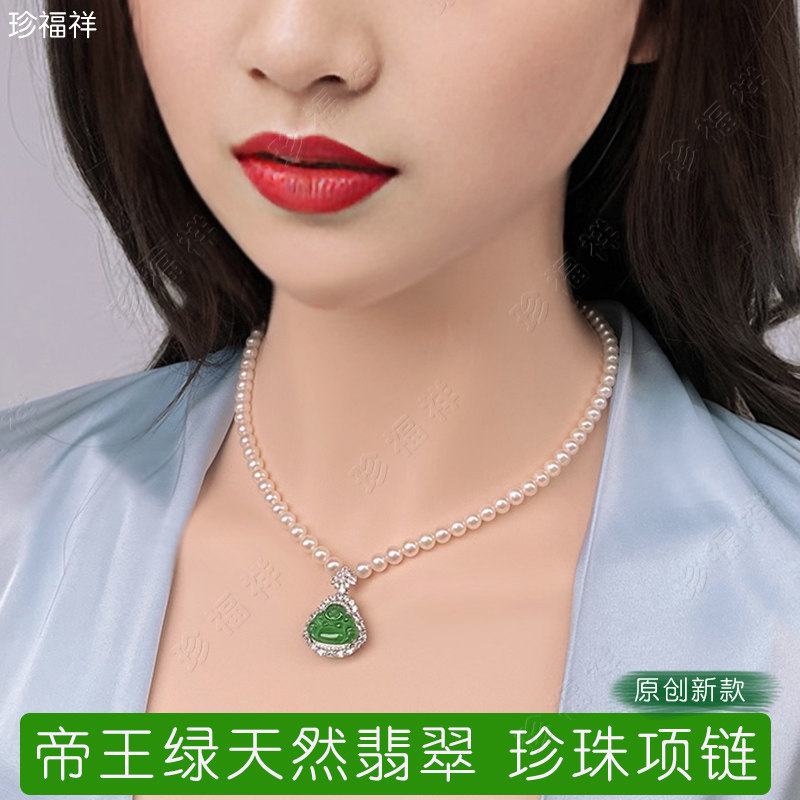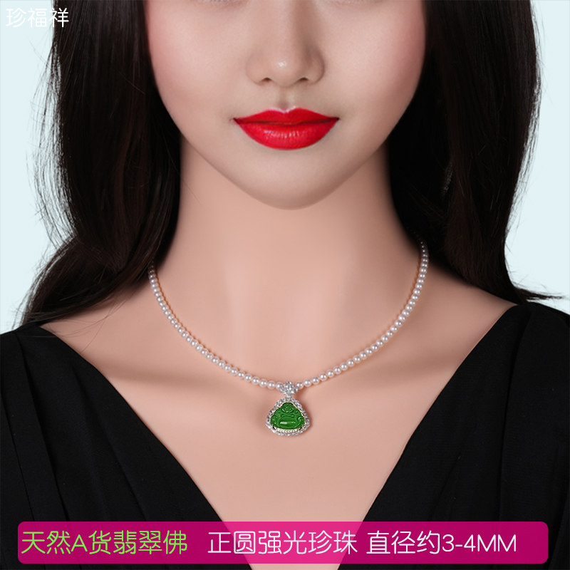 天猫珍福祥旗舰店,帝王绿天然翡翠玉佛天然珍珠项链,帝王绿天然A货翡翠吊坠 强光小米珠正圆珍珠