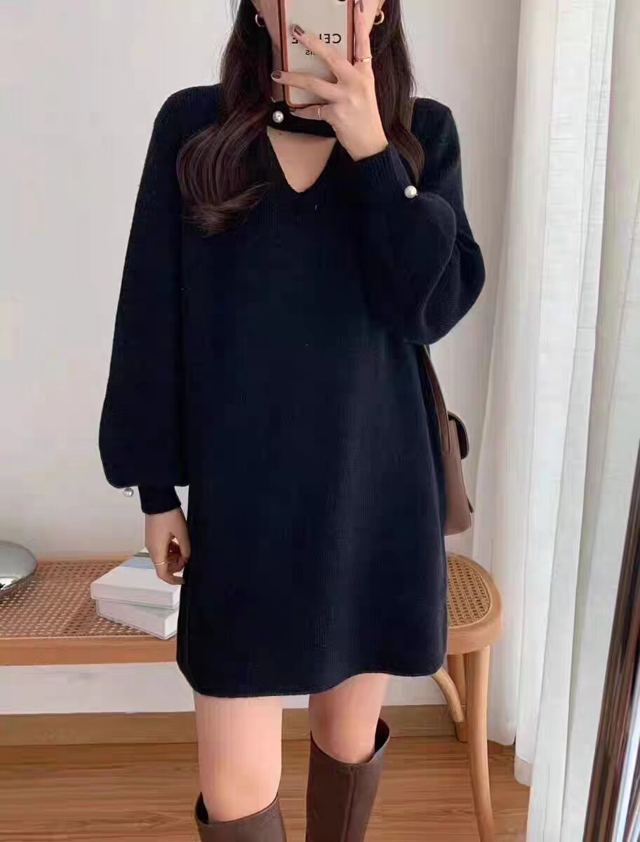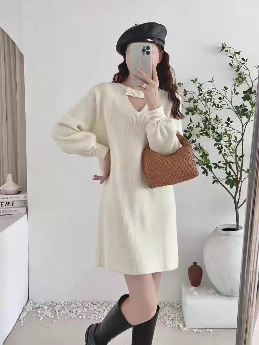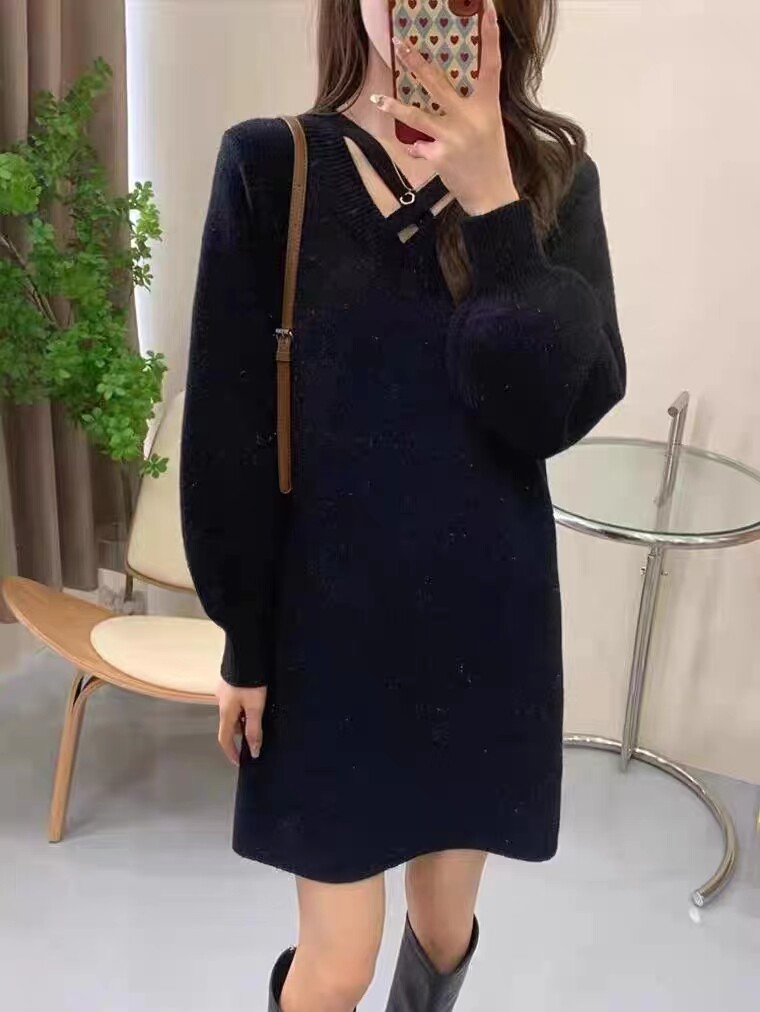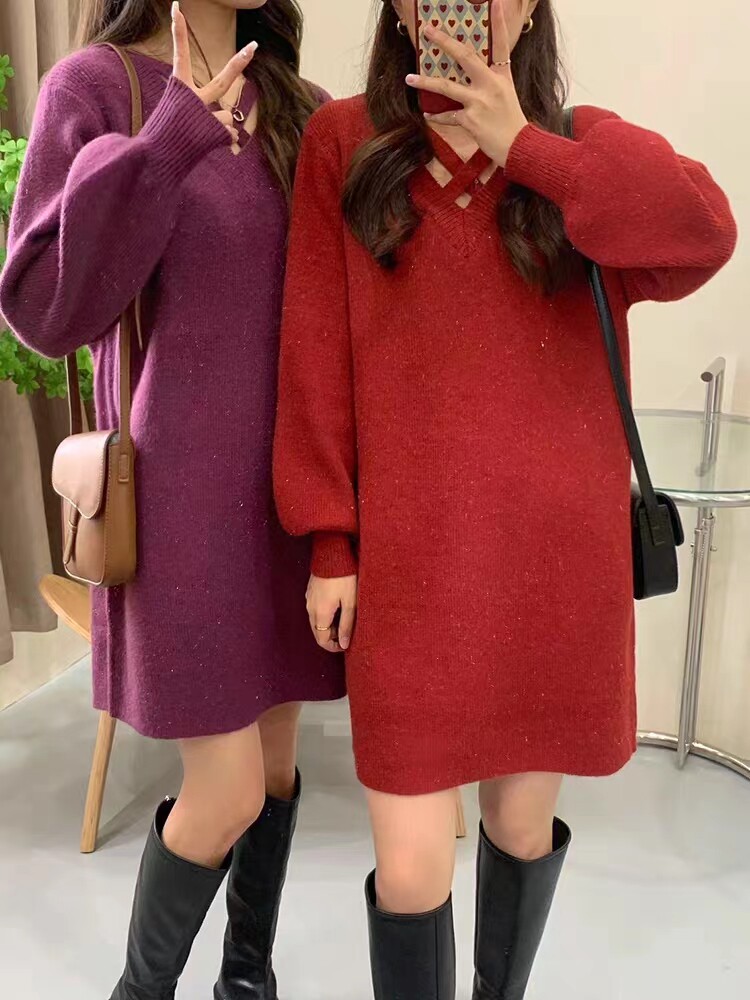 高级感气质中长款红色针织连衣裙女2023秋冬新款宽松打底挂脖毛衣