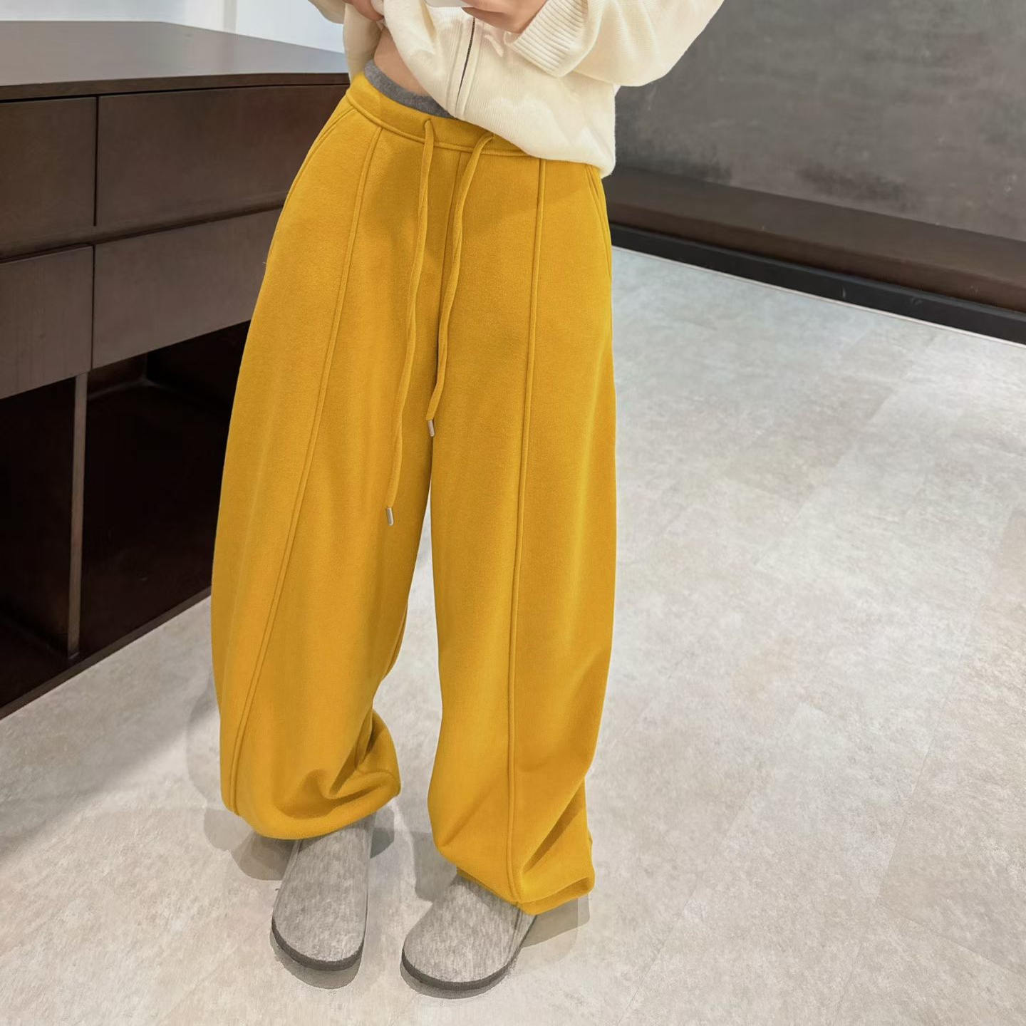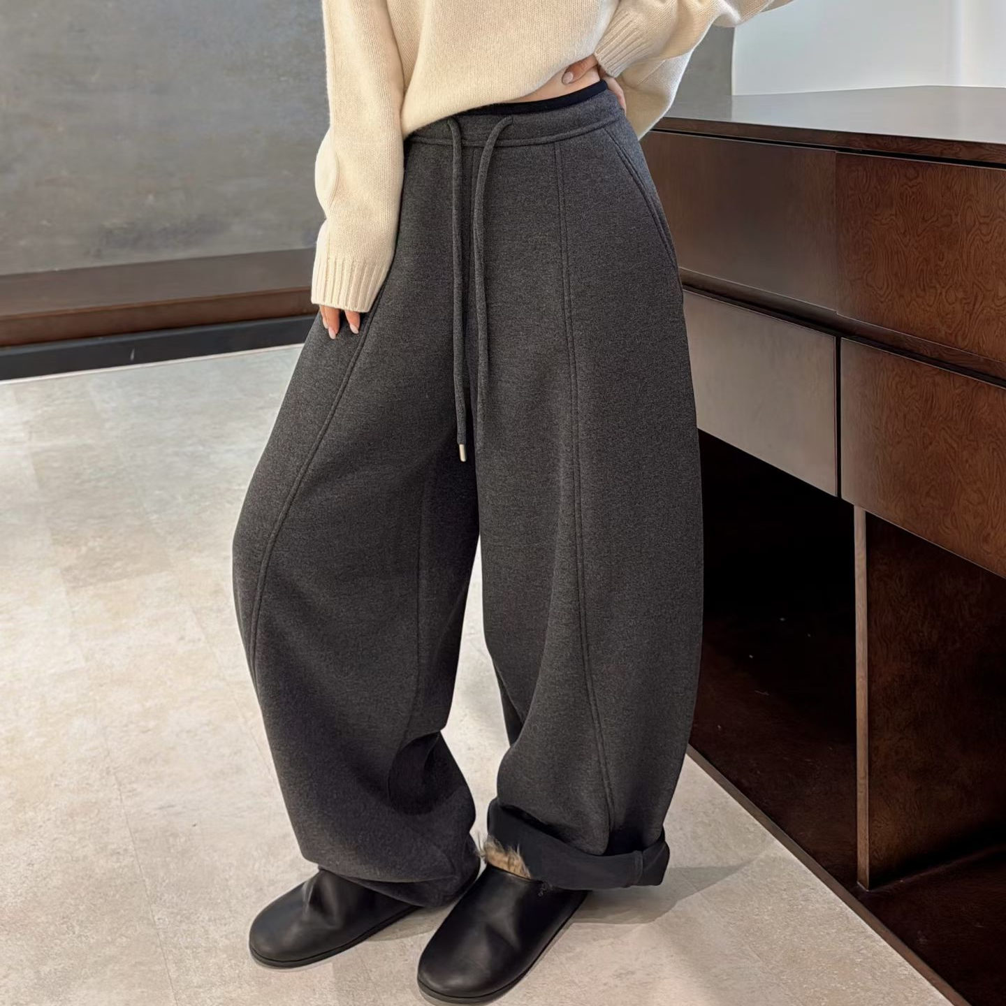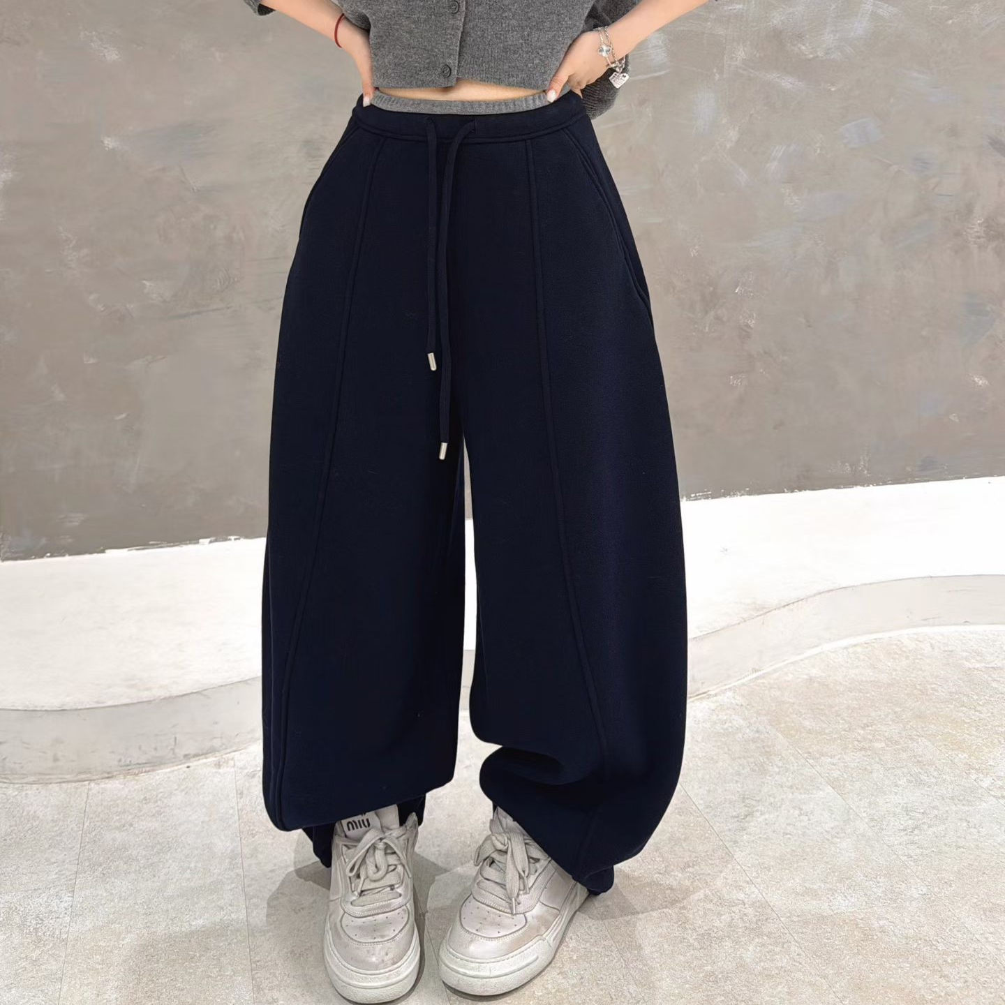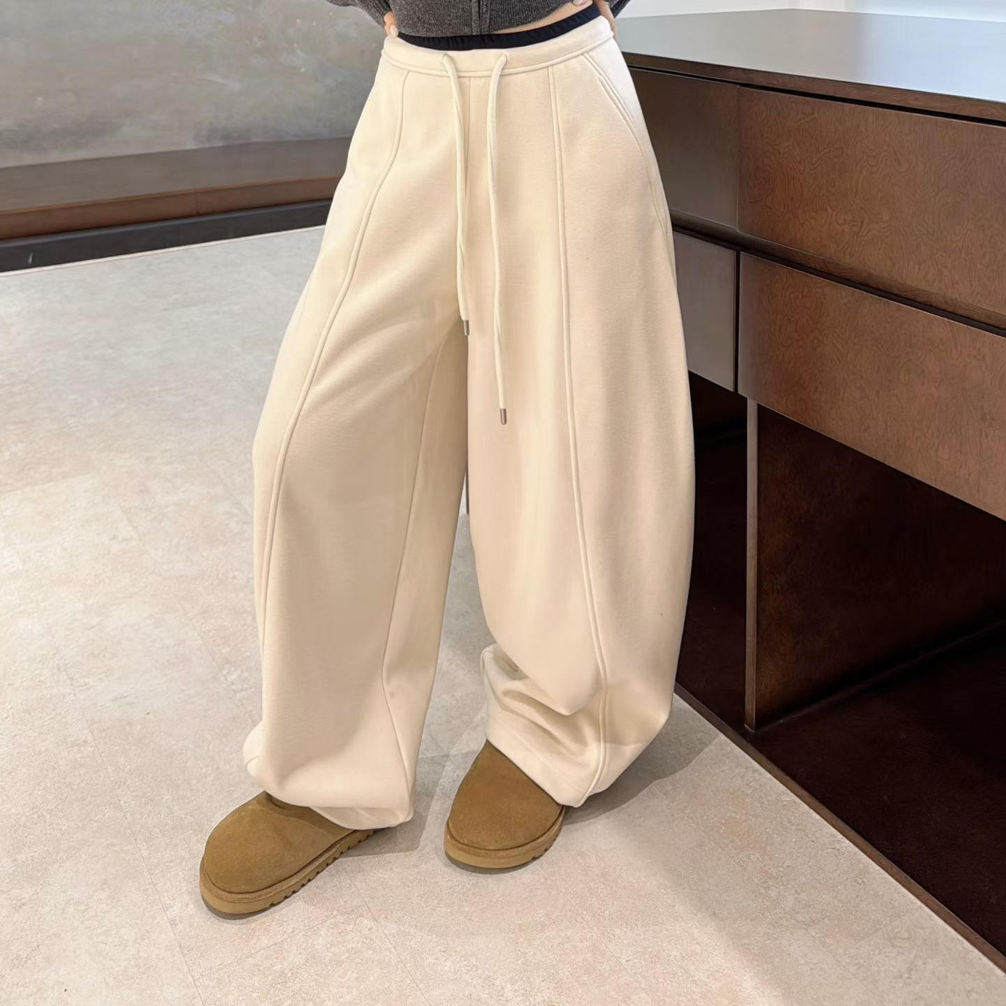 淘宝i.Miss,欧洲站2025冬季腰头撞色松紧系带压线加厚一体绒卫裤阔腿休闲裤潮