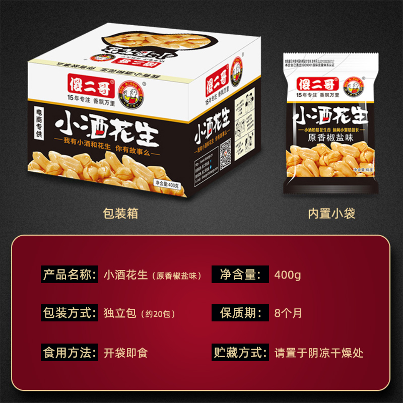 傻二哥小酒花生椒盐味20包五香花生米400g坚果炒货休闲零食下酒菜