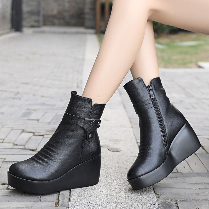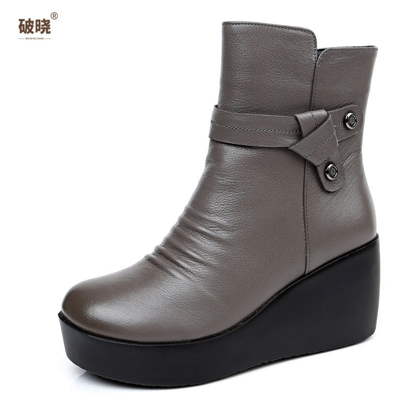 天猫破晓旗舰店,秋冬季真皮坡跟短靴松糕,头层牛皮制作 厚底防水台显瘦增高单棉任选