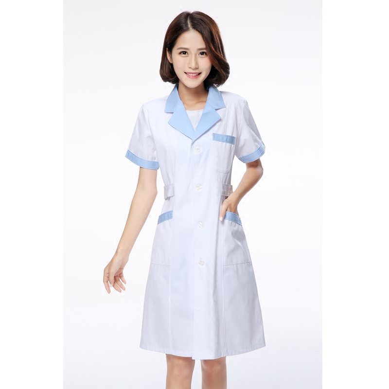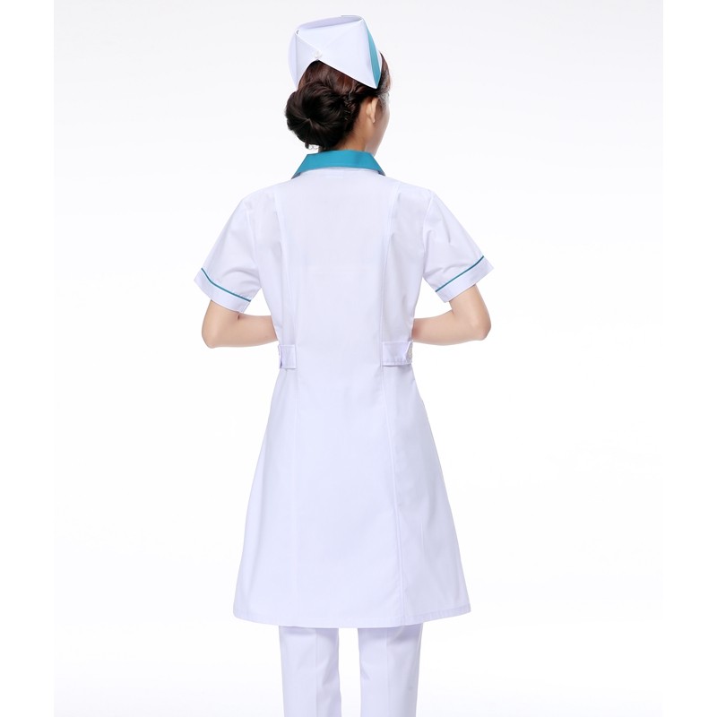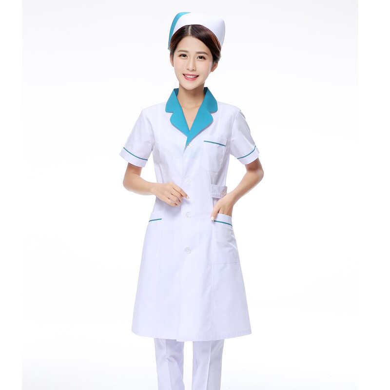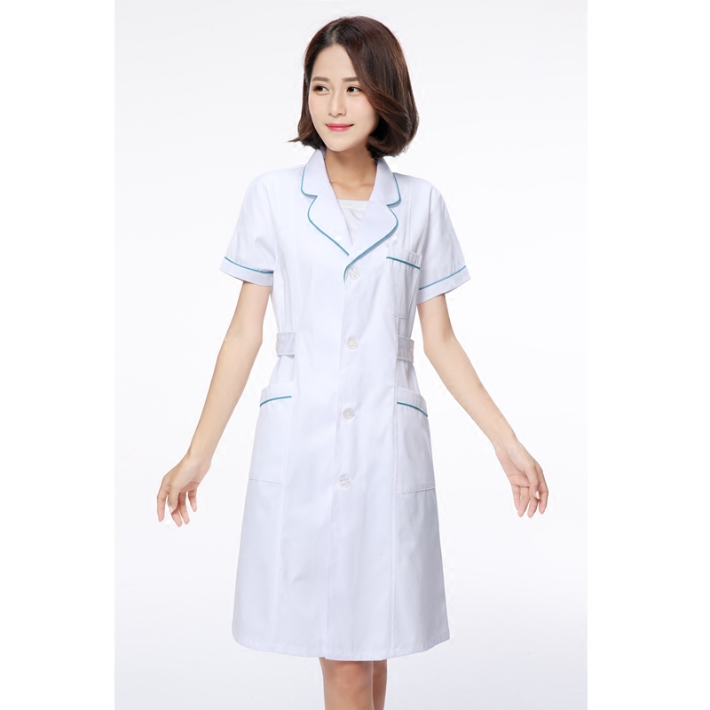 药店服医师加湖蓝边短袖白大褂美容院夏季工作服收腰修身