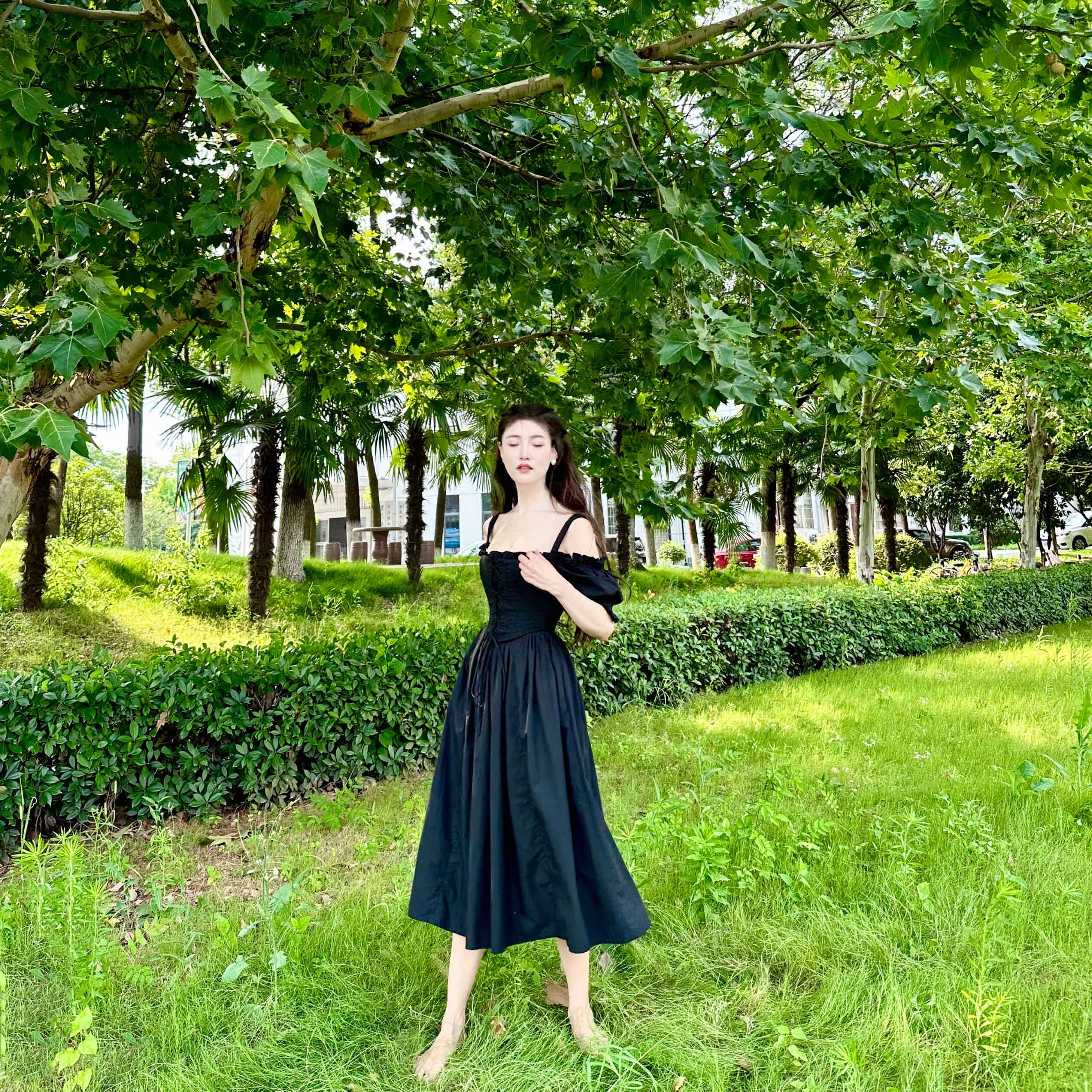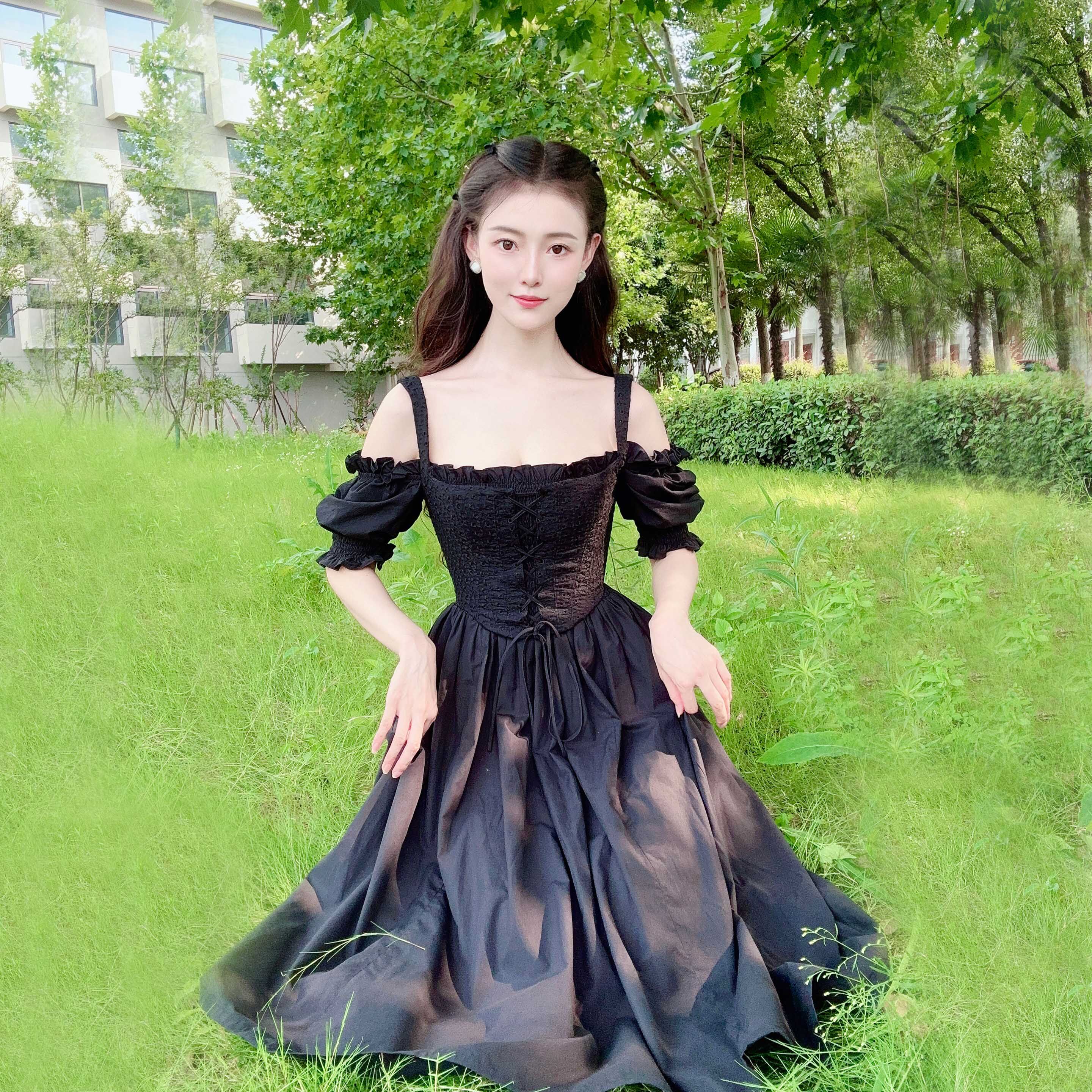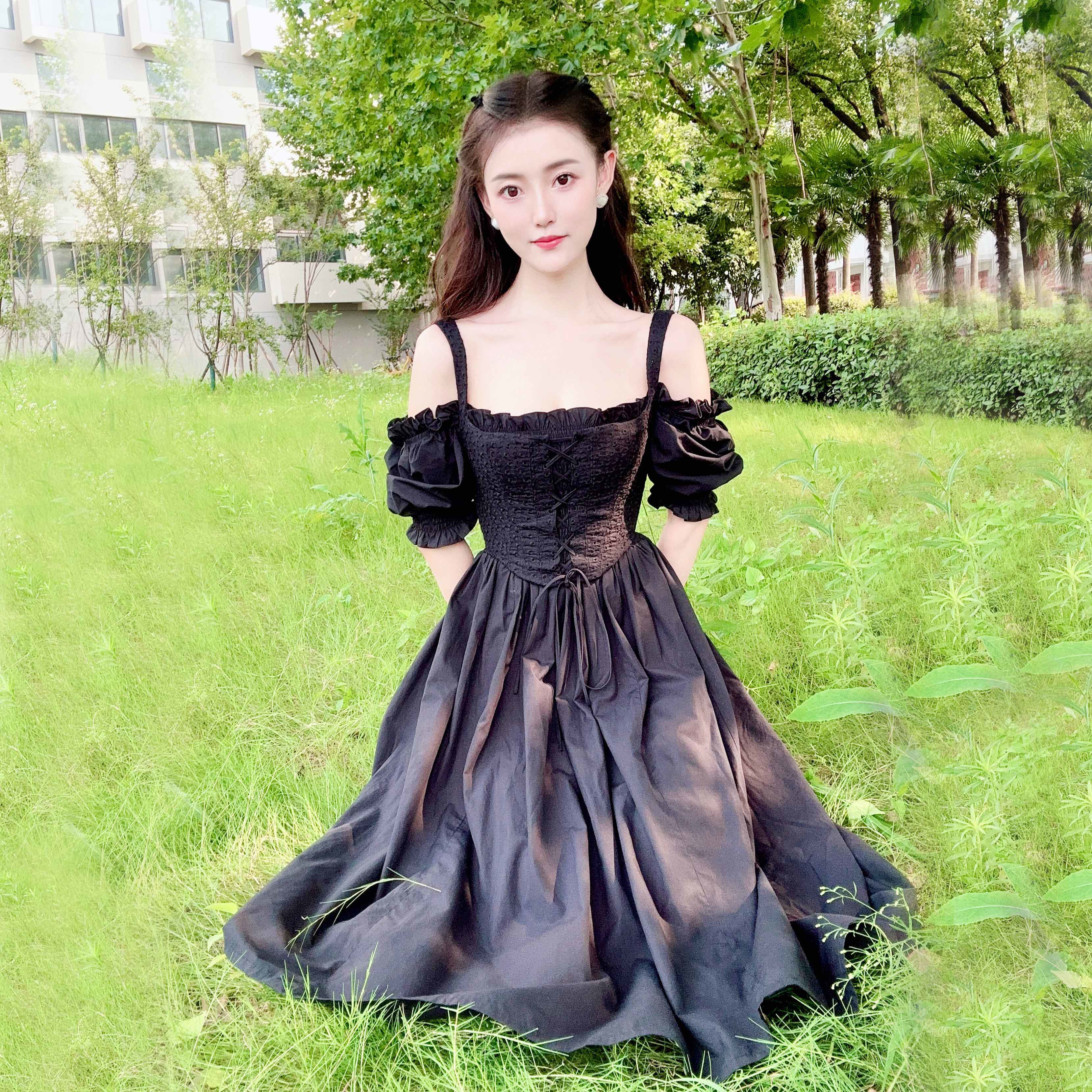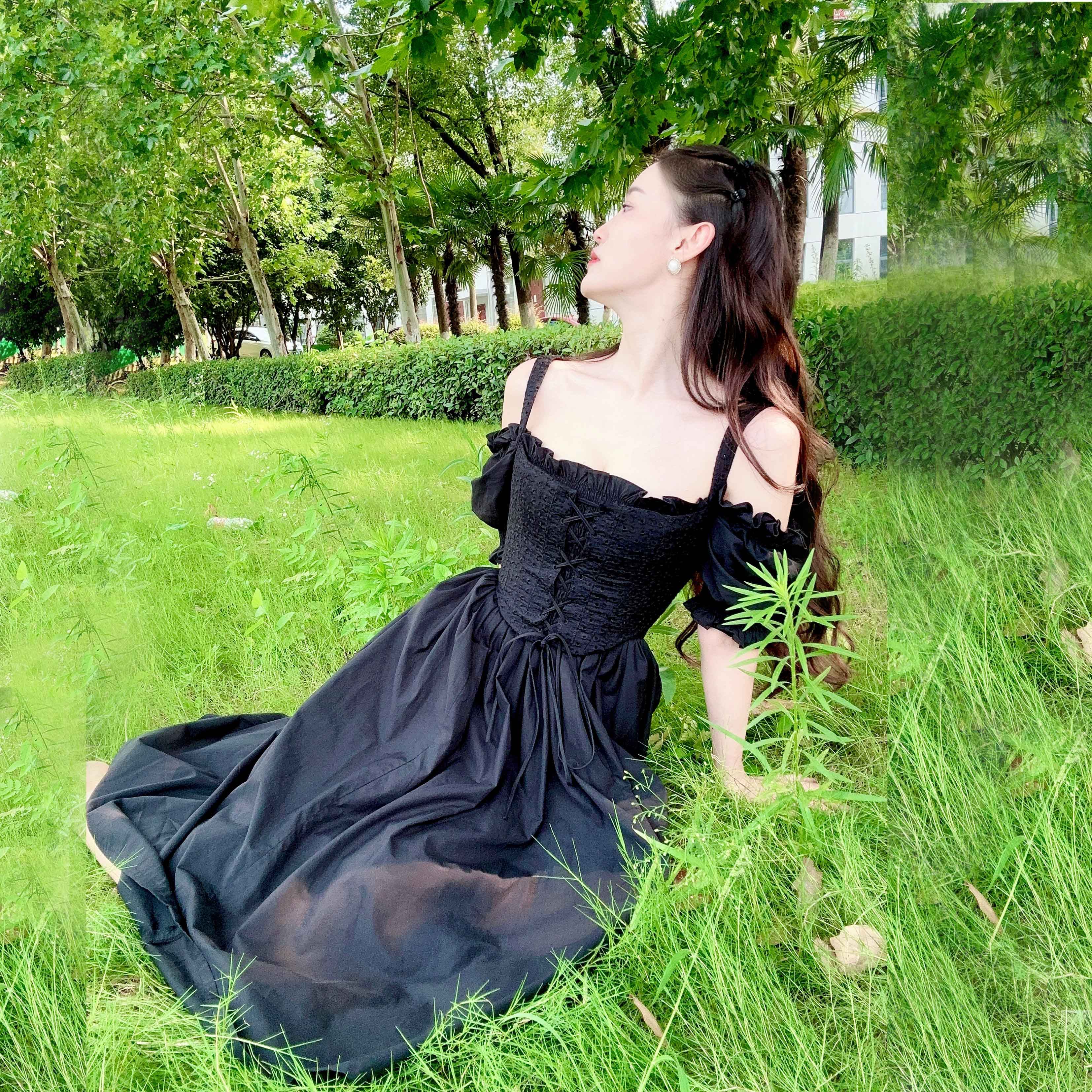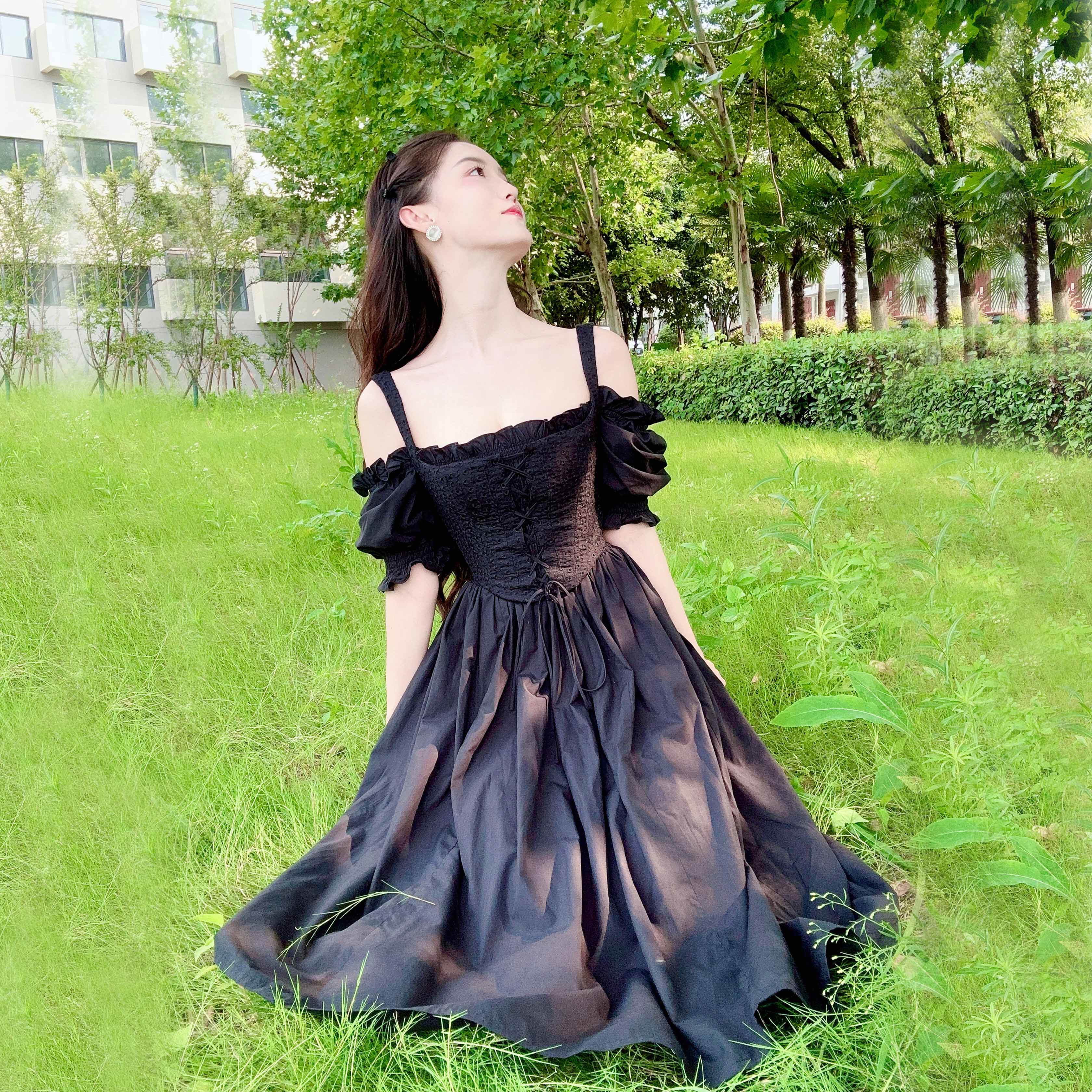 house of cb春秋新款复古方领泡泡袖鱼骨束腰露肩度假两件连衣裙