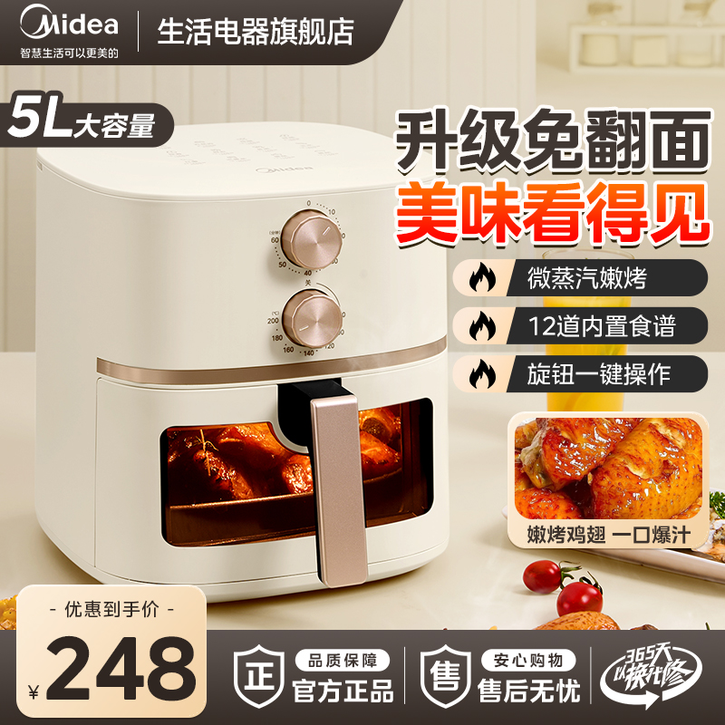 天猫美的生活电器旗舰店,美的新款空气炸锅可视免翻面无油,可视化窗|免翻面匀脆烤|全金属内胆|低油烤