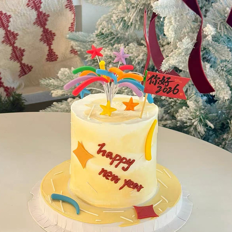 淘宝遇见你烘焙,2026新年快乐祝福语小旗蛋糕装饰多巴胺彩色星星礼花跨年装扮插件