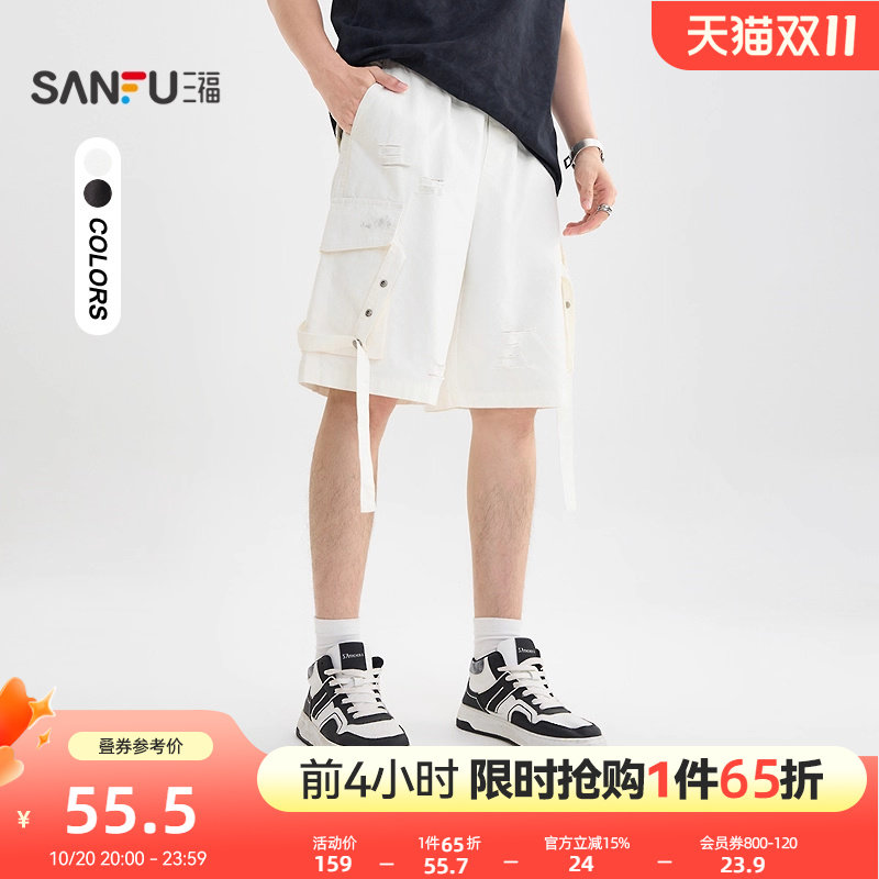 天猫三福服饰官方旗舰店,三福2025夏季男士飘带工装中裤 街头宽松橡筋腰头裤子504060