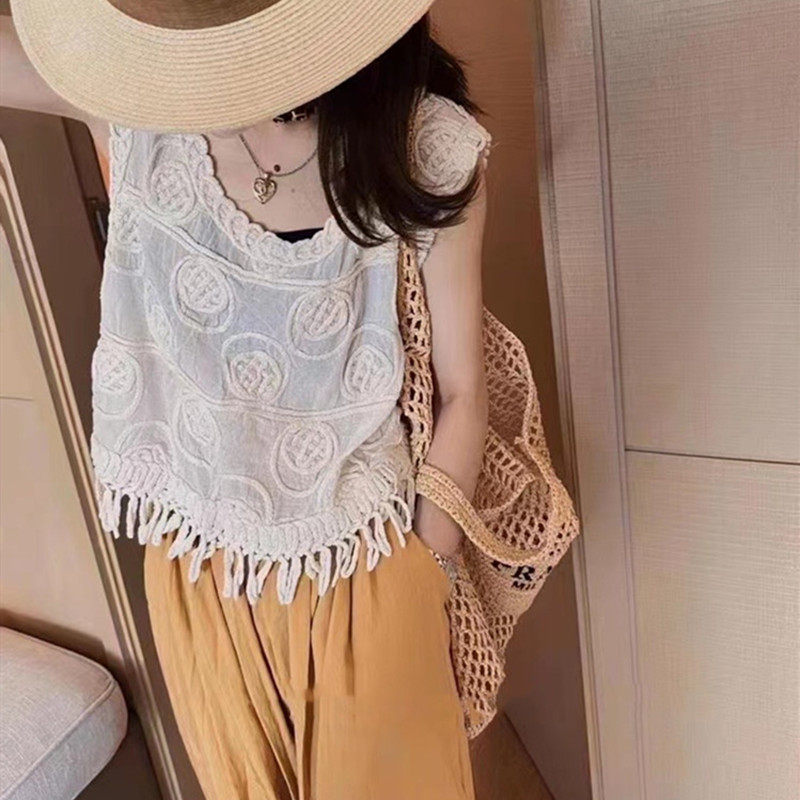 淘宝七七女孩8,设计感辣妹甜美钩花背心女夏2023宽松复古休闲百搭薄款无袖短款潮
