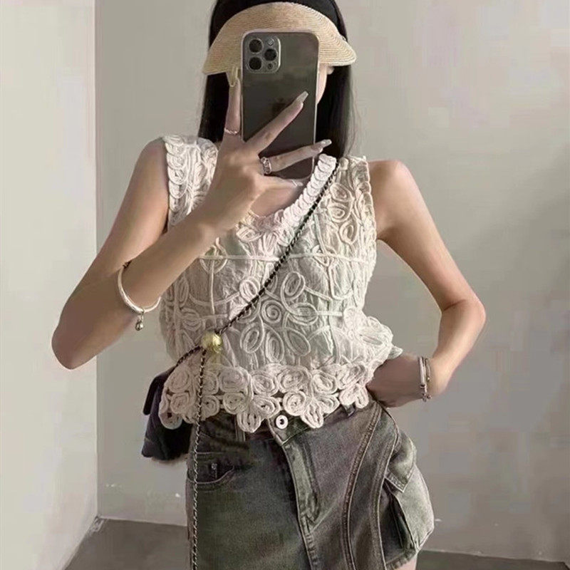 设计感辣妹甜美钩花背心女夏2023宽松复古休闲百搭薄款无袖短款潮