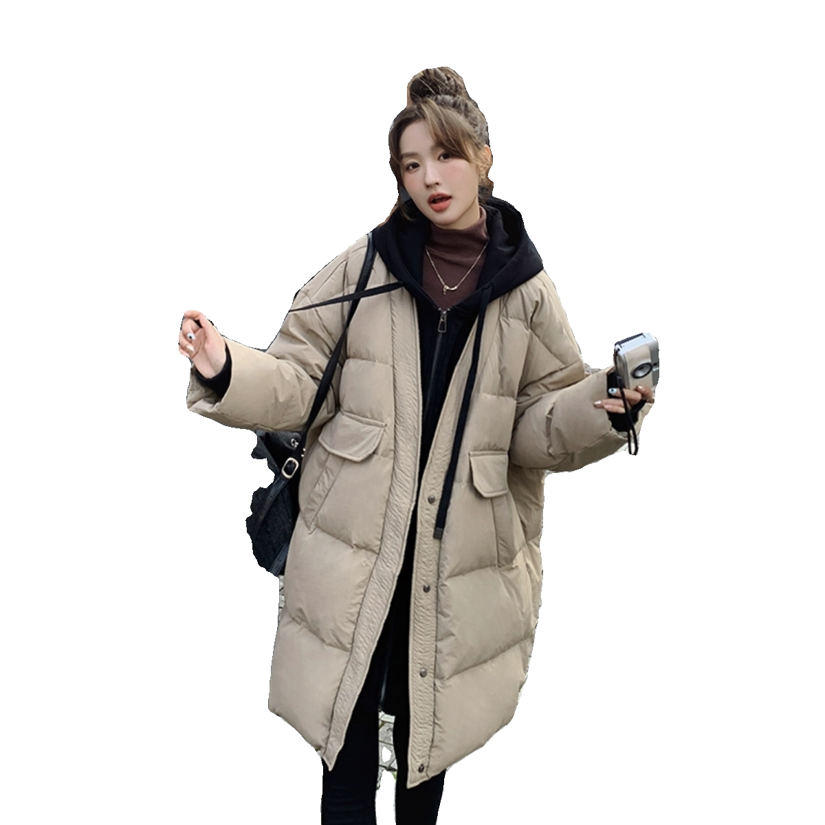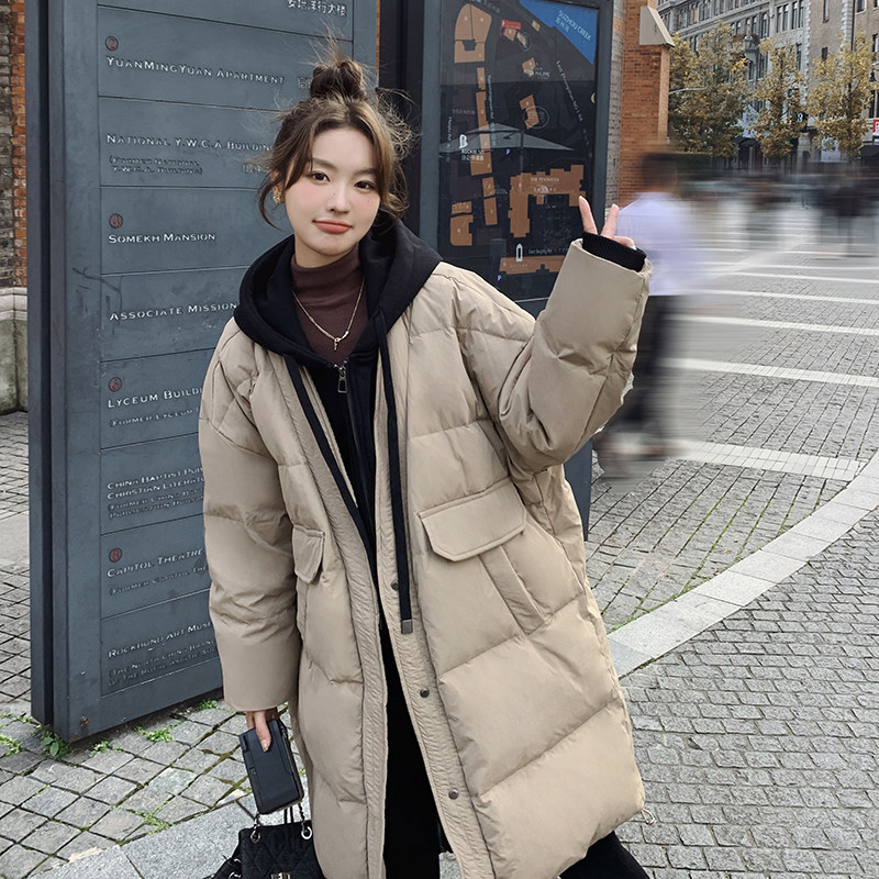 胖mm卡其色羽绒服外套女假两件冬装大码女装显瘦拼接御寒羽绒衣潮