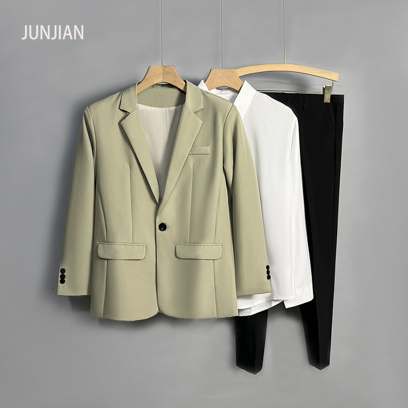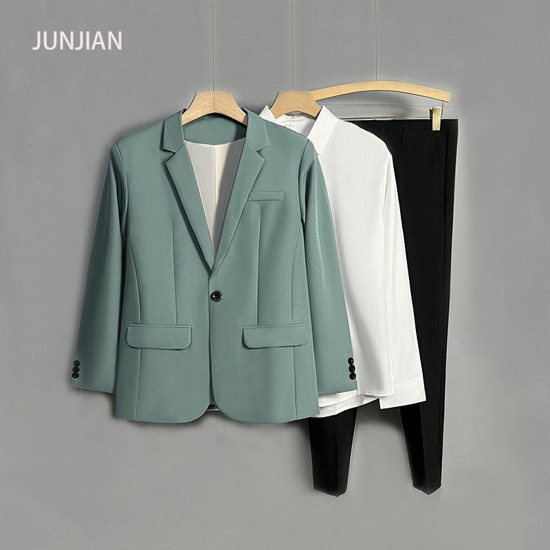 淘宝君健服饰,浅灰色西服三件套男西装外套结婚兄弟团礼服衬衫西裤工装制服套装