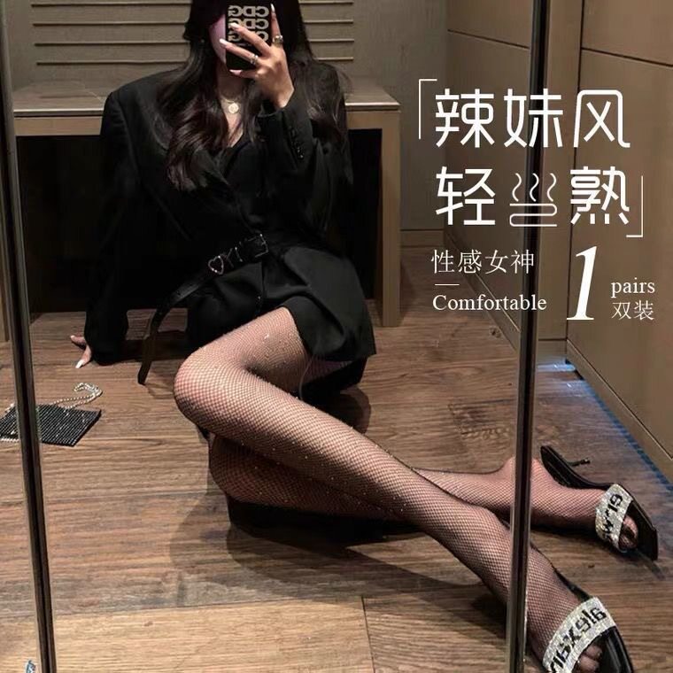 淘宝蜜桃初见 保密发货,网红辣妹渔网袜开裆闪钻黑丝袜女ins蹦迪夜店带钻连裤袜情调薄款