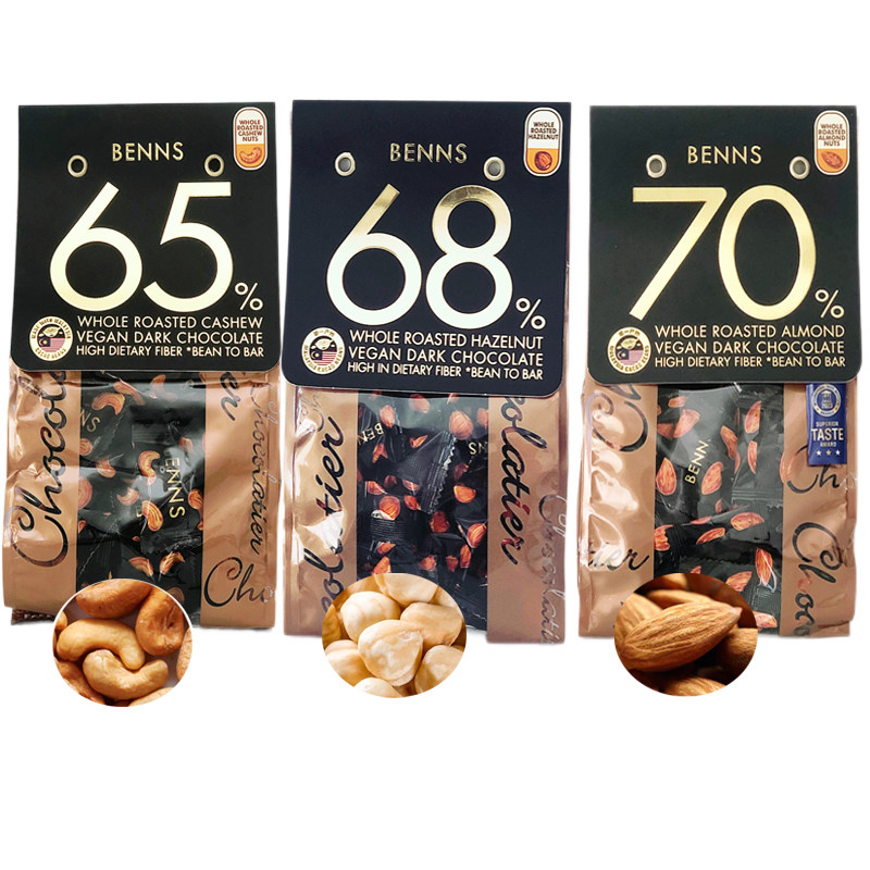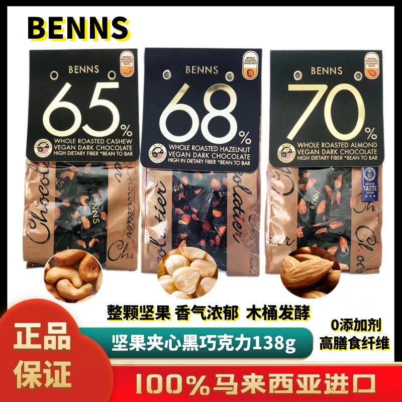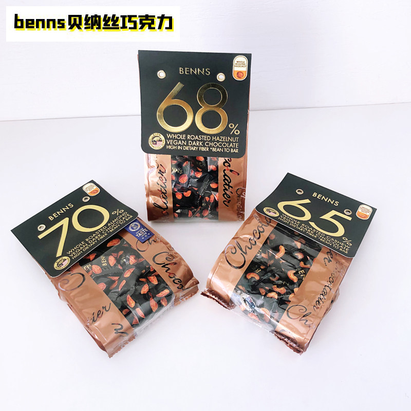 贝纳丝benns坚果巧克力巴坦木夹心黑巧克力70%68%65%榛子腰果坚果