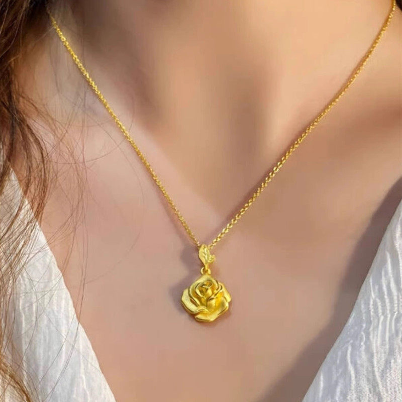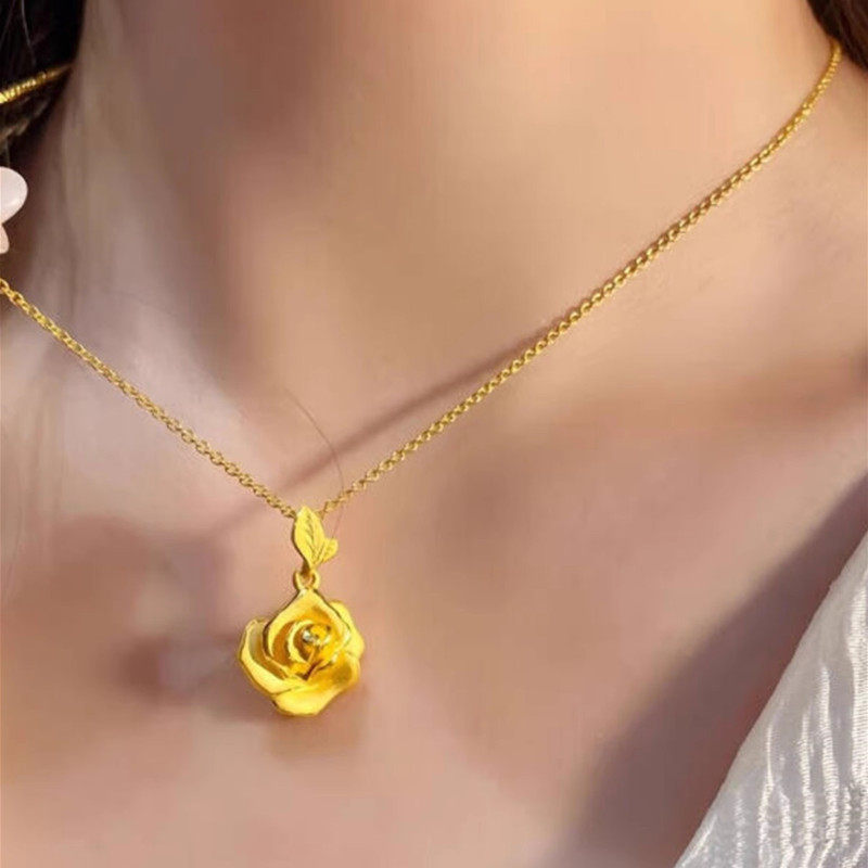 复古浪漫24K纯金玫瑰花项链新款999足金吊坠女士黄金锁骨链送女友