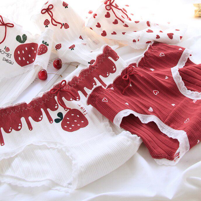 淘宝萌兔兔内衣,爱心草莓大红色木耳边少女女士内裤纯棉裆中腰三角裤女生内裤包邮