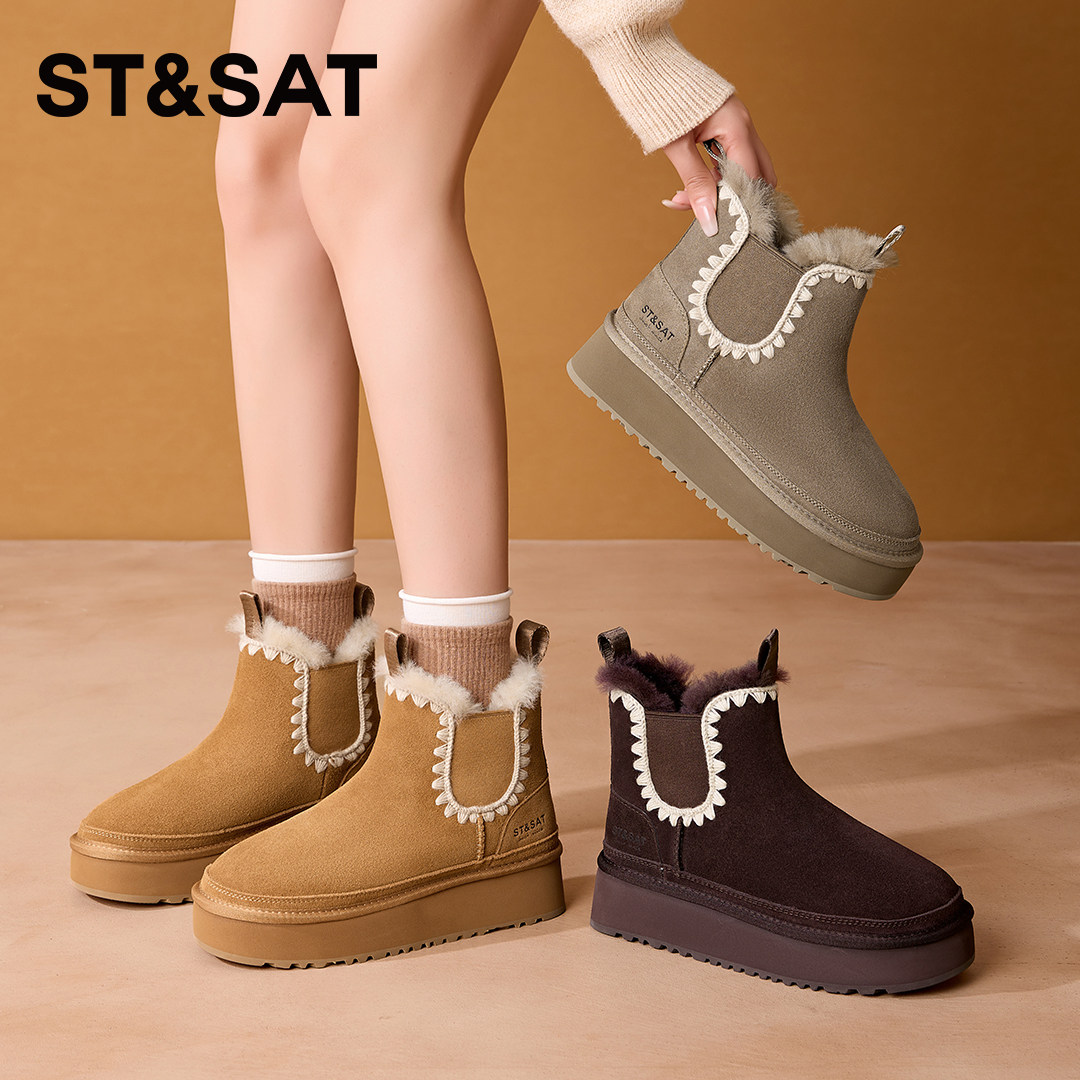 星期六新款毛线切尔西舒适女靴子雪地靴松糕厚底增高透气休闲鞋