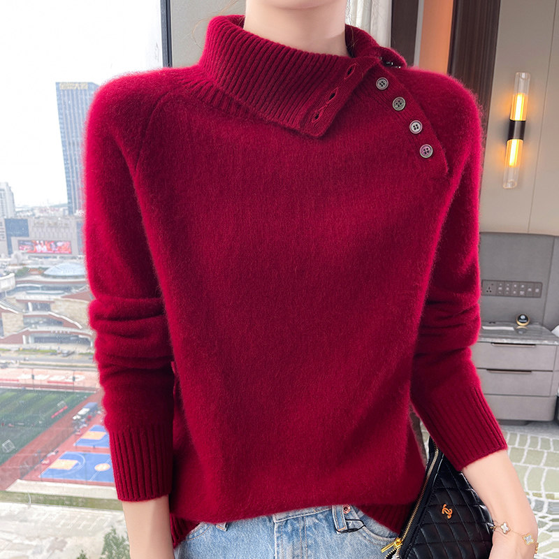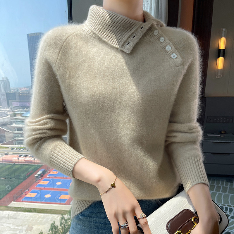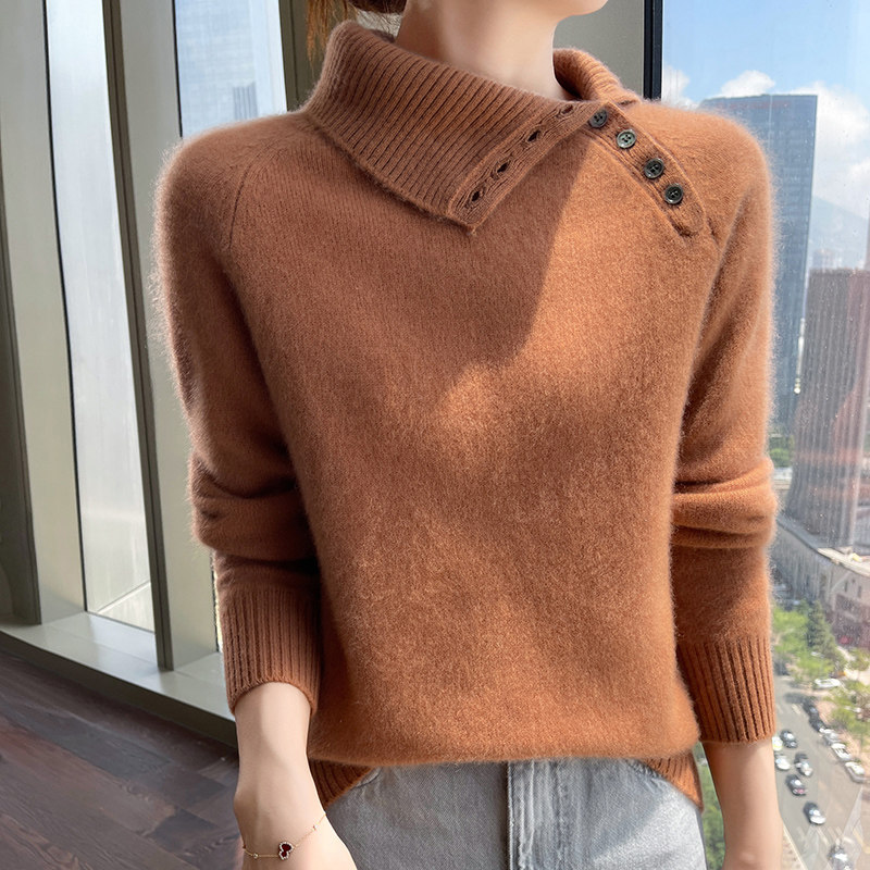 100%纯山羊绒衫女高翻领纽扣加厚毛衣宽松慵懒羊毛衫针织打底上衣
