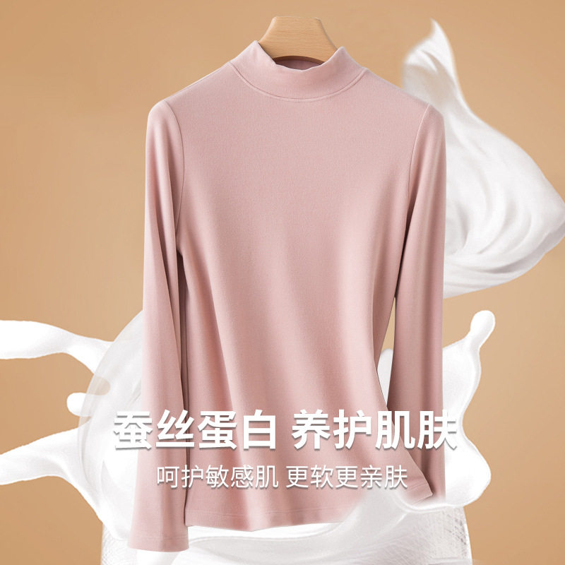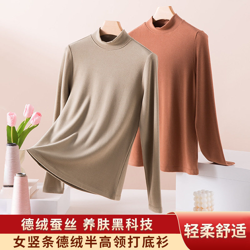 秋冬款女竖条德绒半领打底衫磨毛蚕丝蛋白T恤女高弹修身保暖上衣